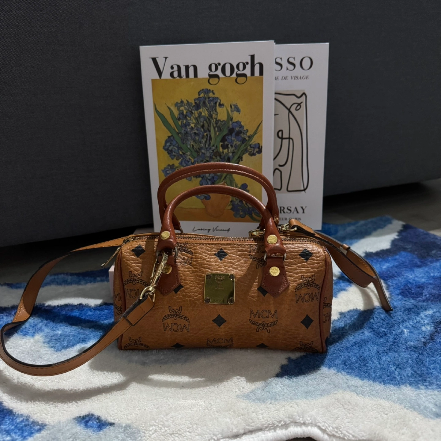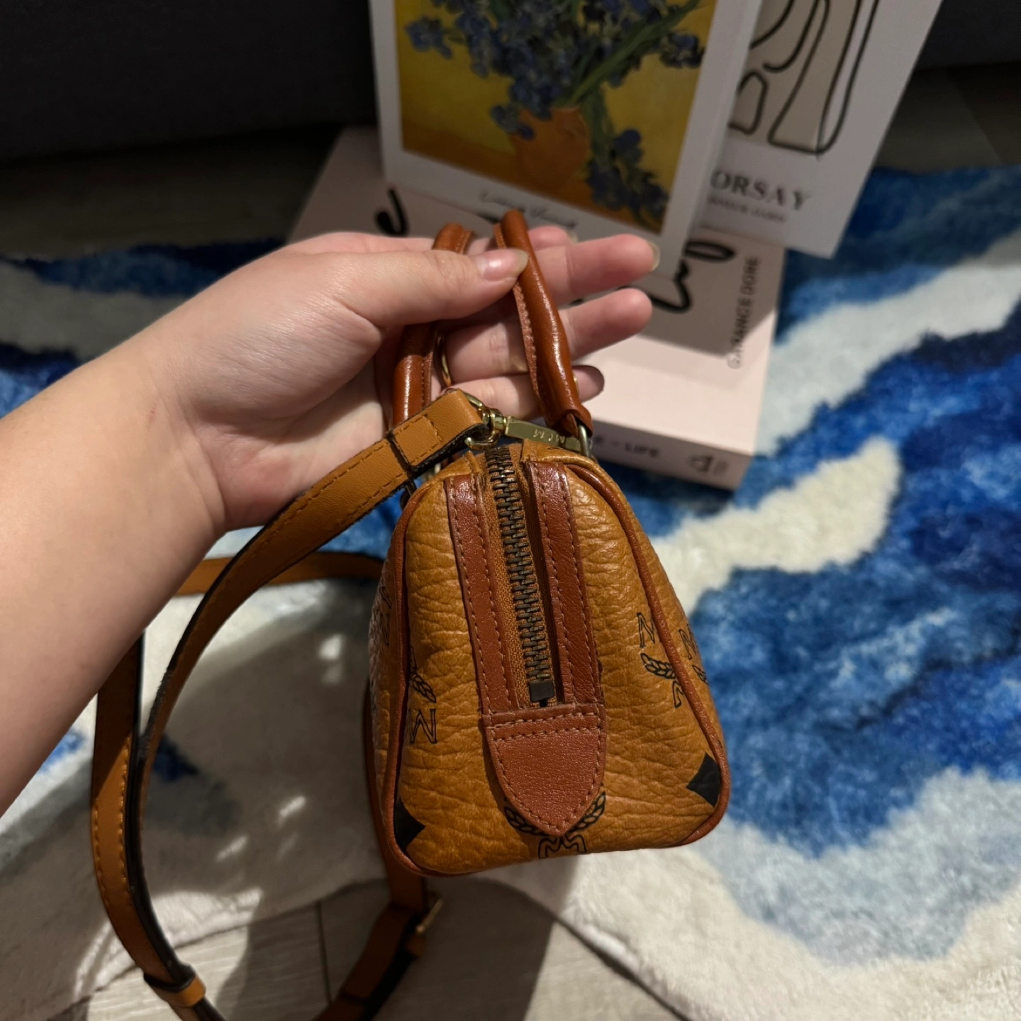 This MCM mini bag in a warm tan leather features a structured cylindrical shape with a textured surface, offering a stylish and compact design. Equipped with short top handles and an adjustable strap, it provides versatile carrying options. The gold-tone hardware adds a touch of elegance to this chic accessory.