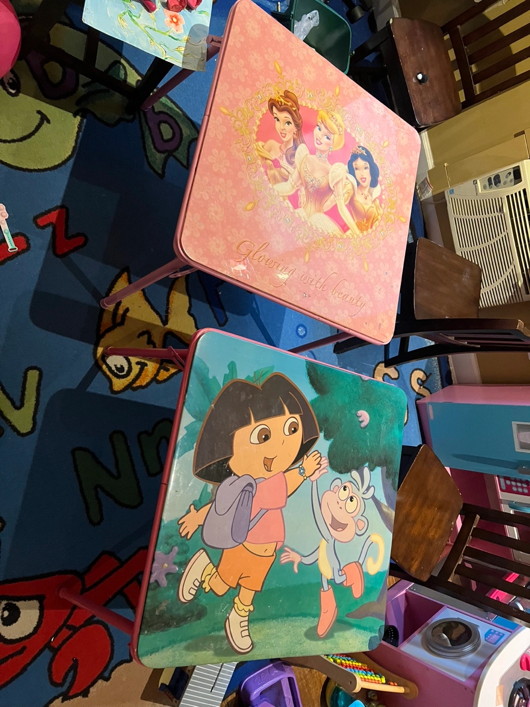 172Two children's folding activity tables. One features Disney Princesses, the other Dora the Explorer and Boots. Pink metal frame. Good for arts and crafts or play.