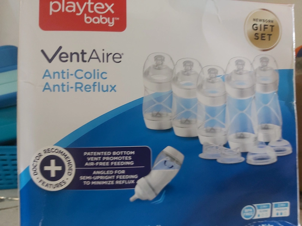 Newborn gift set. Includes multiple Playtex VentAire anti-colic and anti-reflux baby bottles. Patented bottom vent. Angled for semi-upright feeding to minimize reflux. Doctor recomend₩