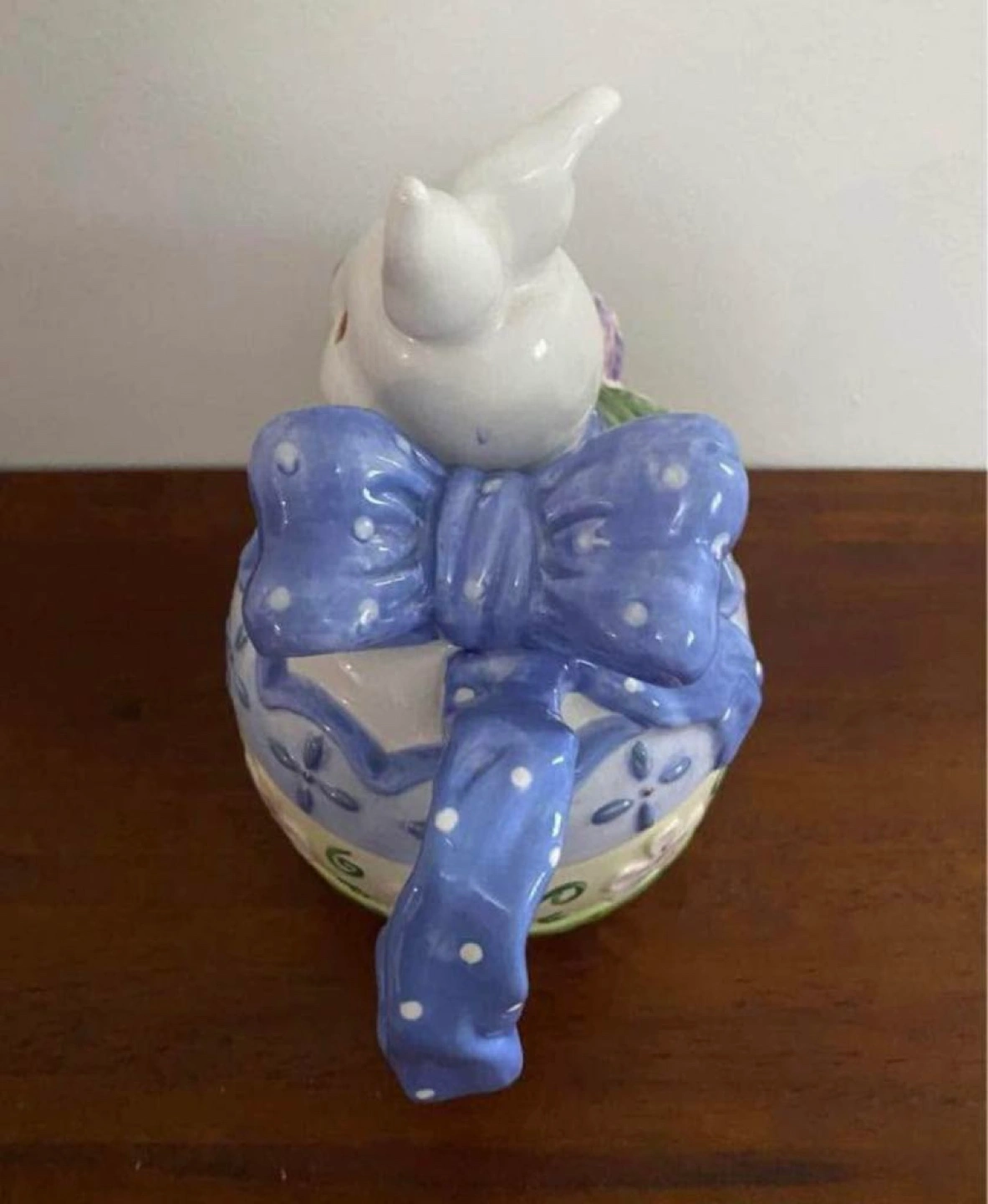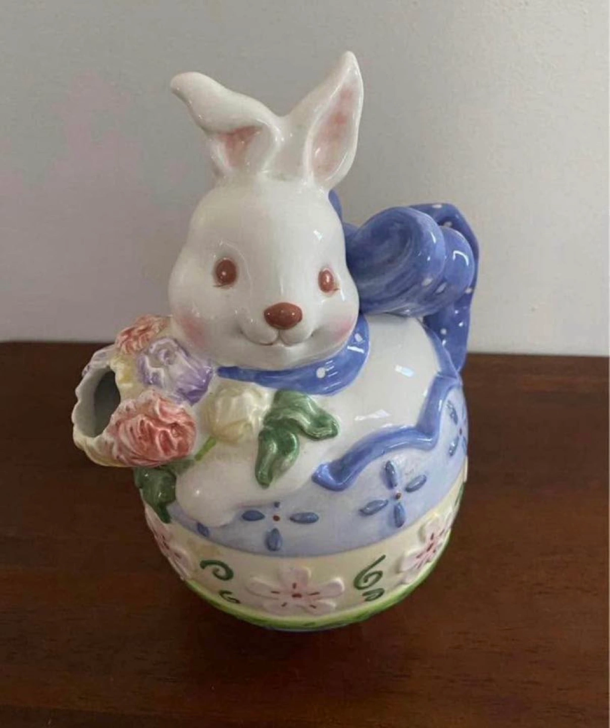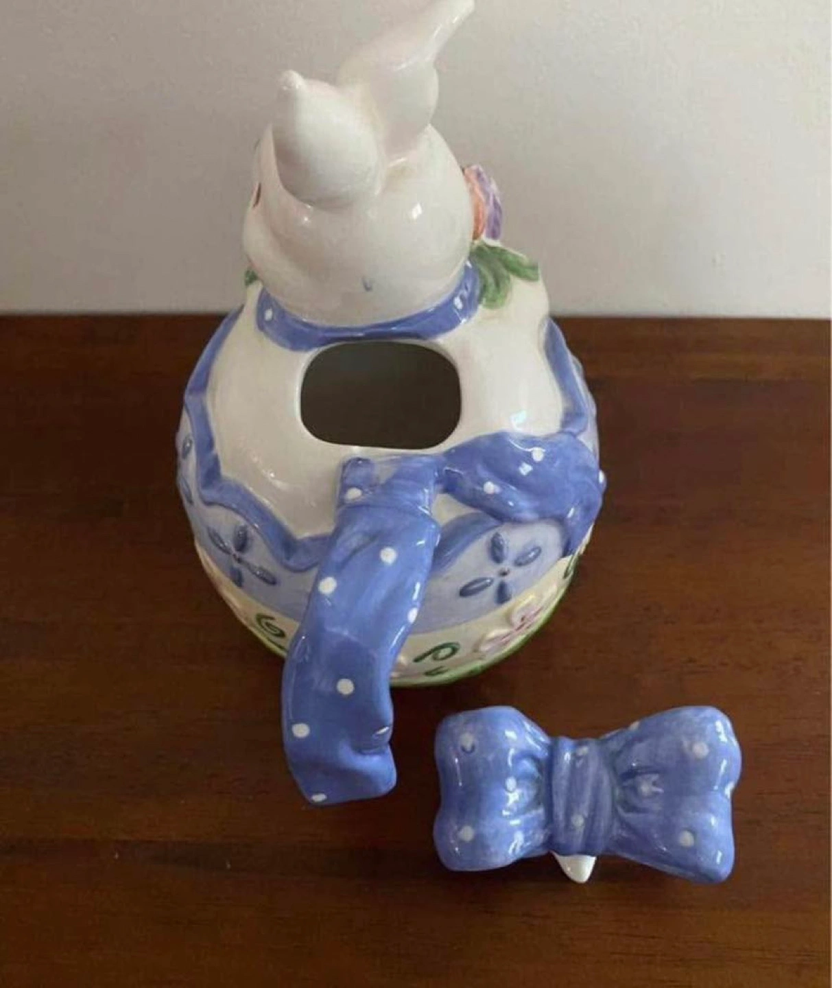 shaped like an Easter bunny. Features a blue polka dot bow and floral accents. Perfect for spring decor or serving drinks. Includes a separate lid.