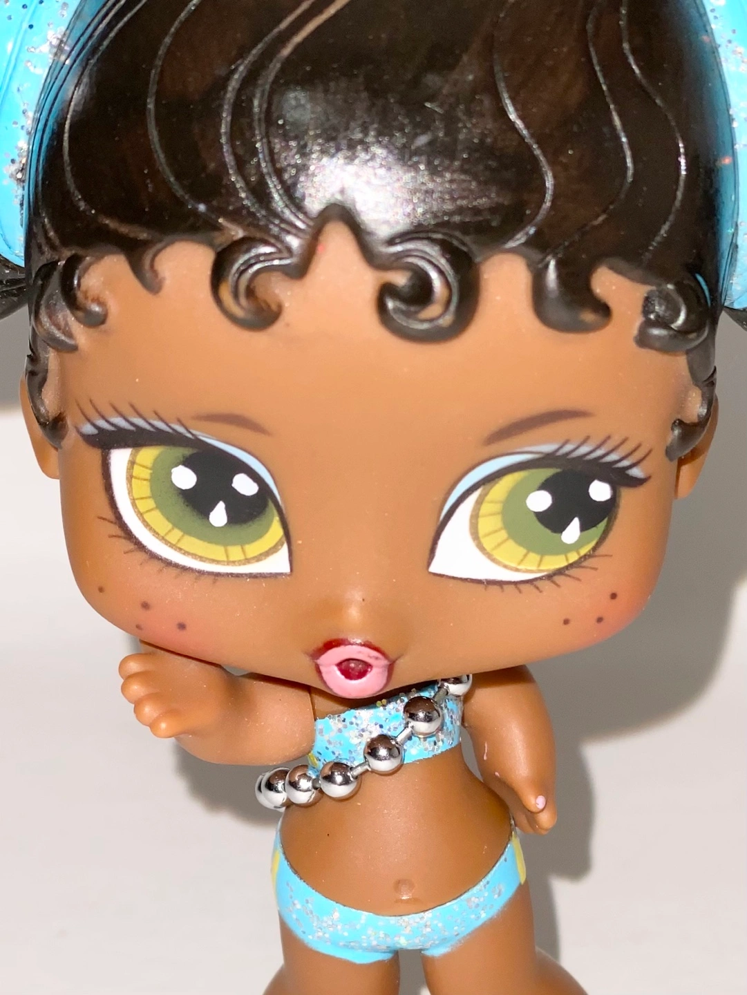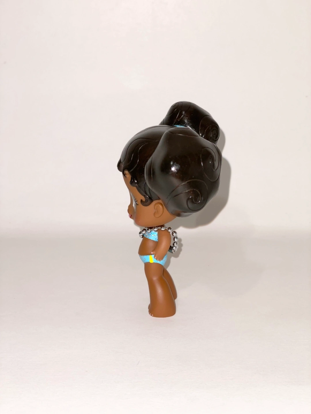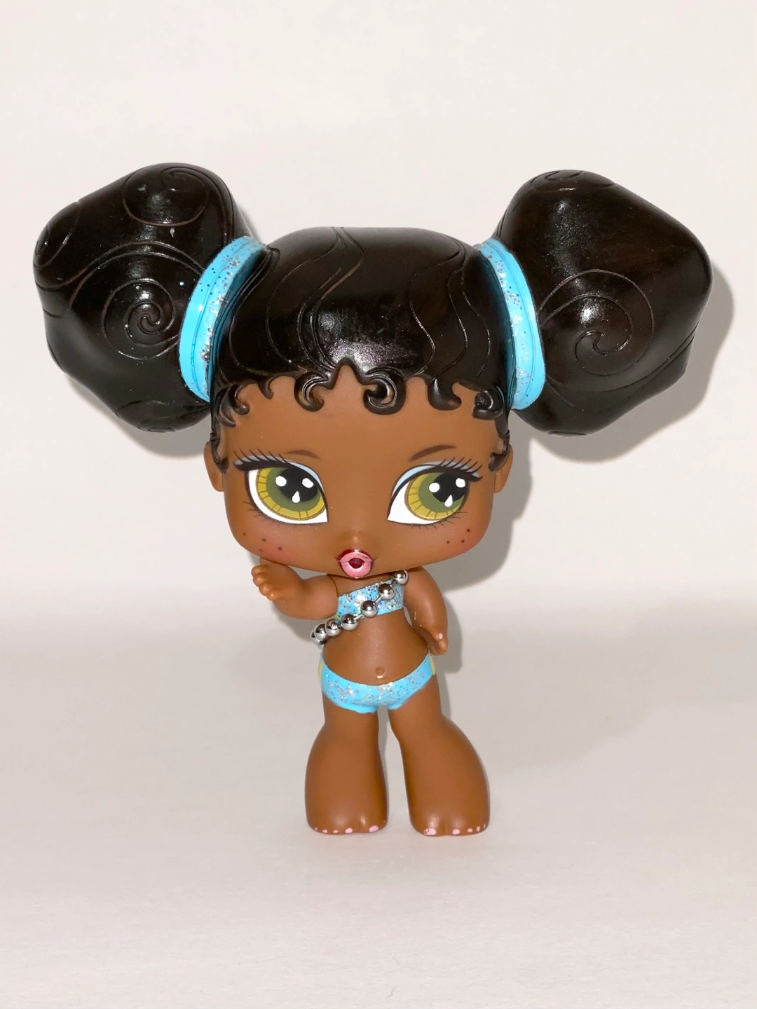 Cute Bratz mini collectible doll. Features dark brown hair in two buns, a light blue sparkly bikini, and a silver beaded necklace.