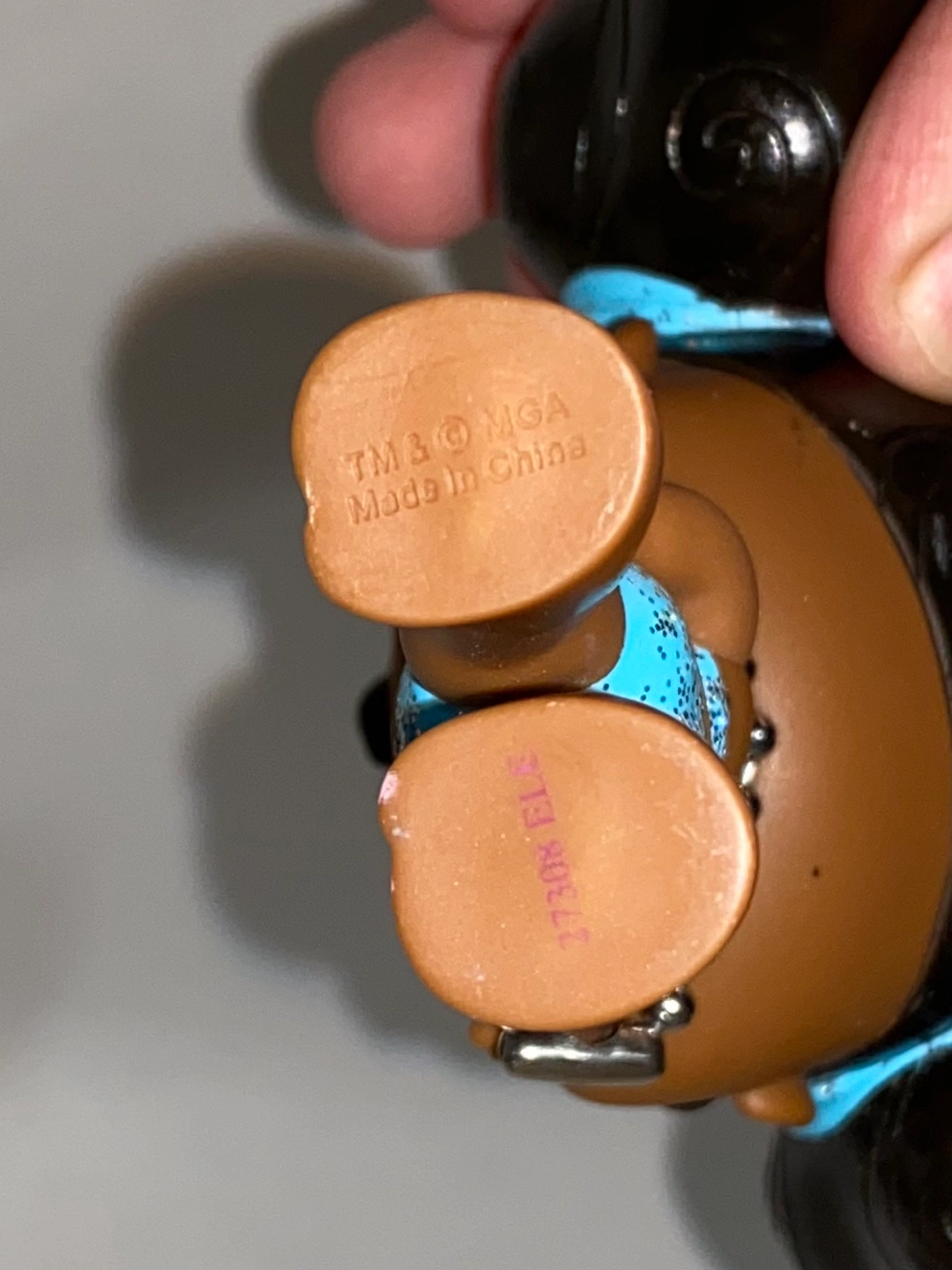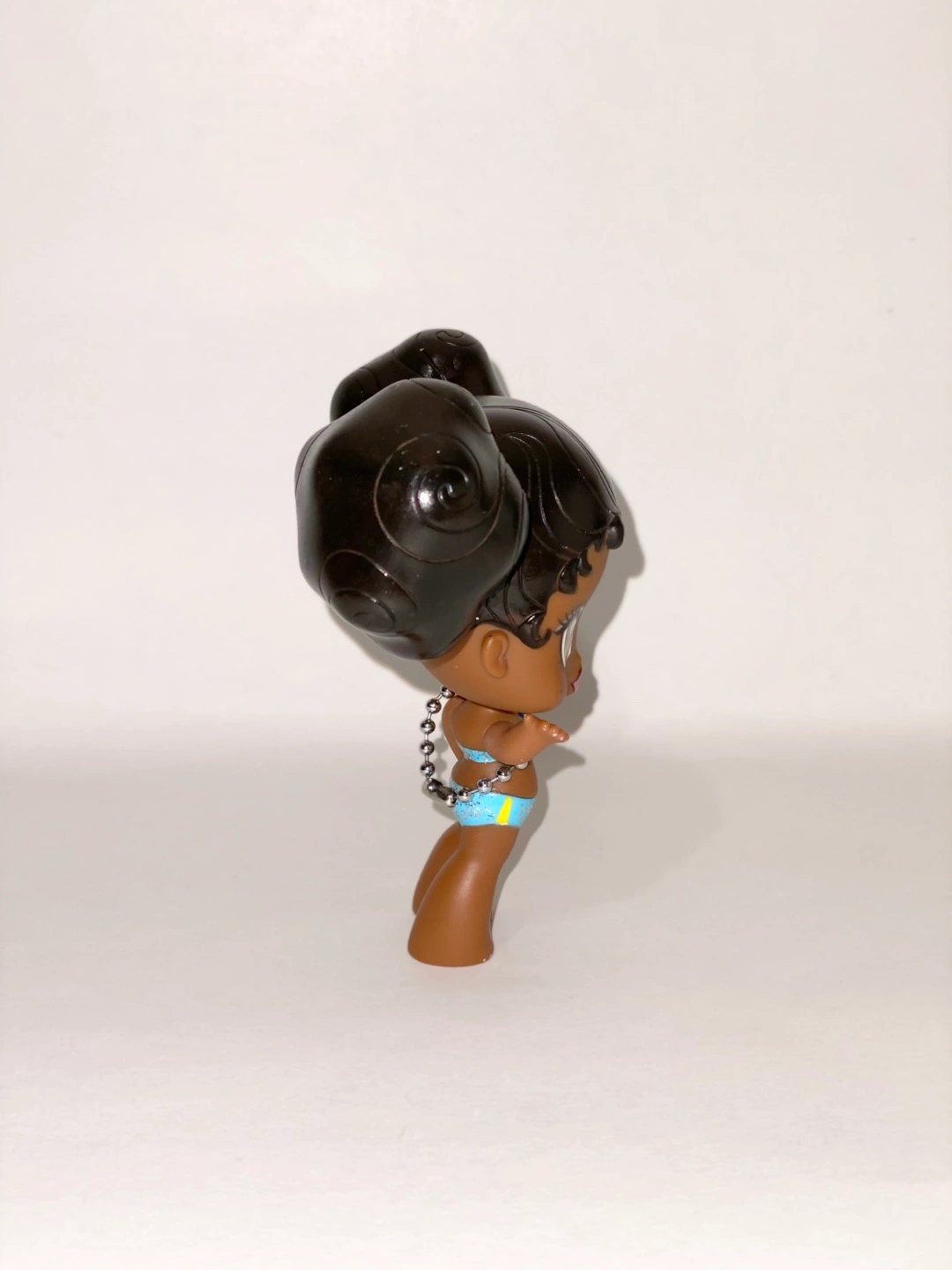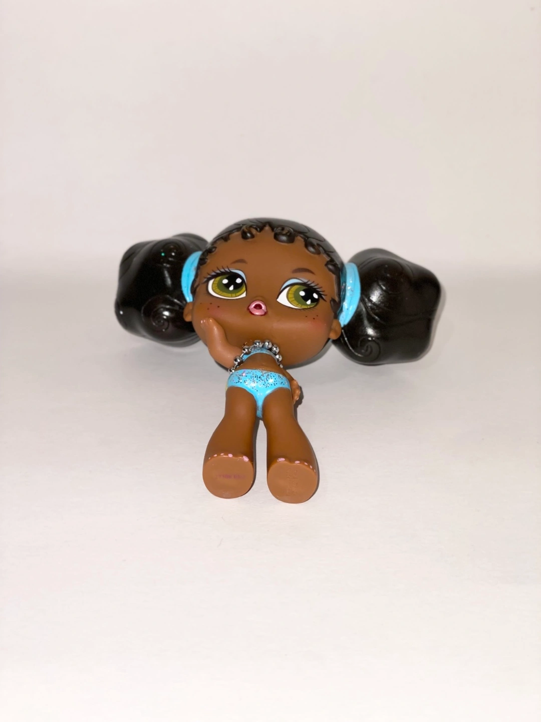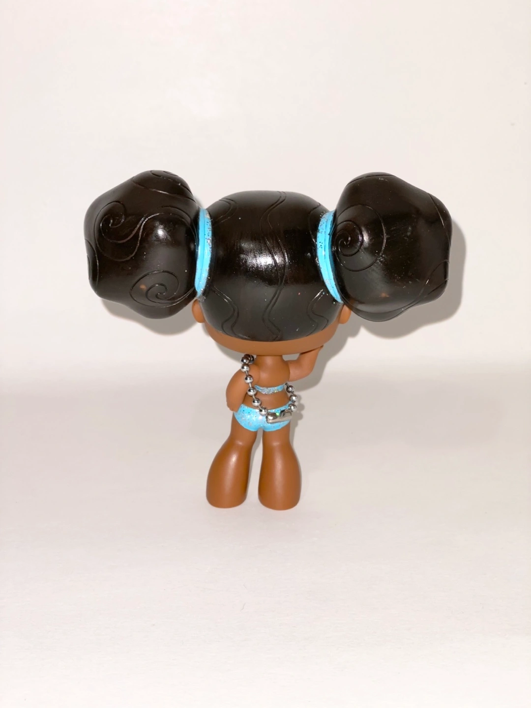 Cute Bratz mini collectible doll. Features dark brown hair in two buns, a light blue sparkly bikini, and a silver beaded necklace.