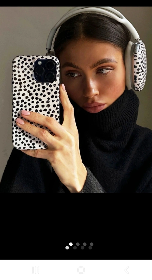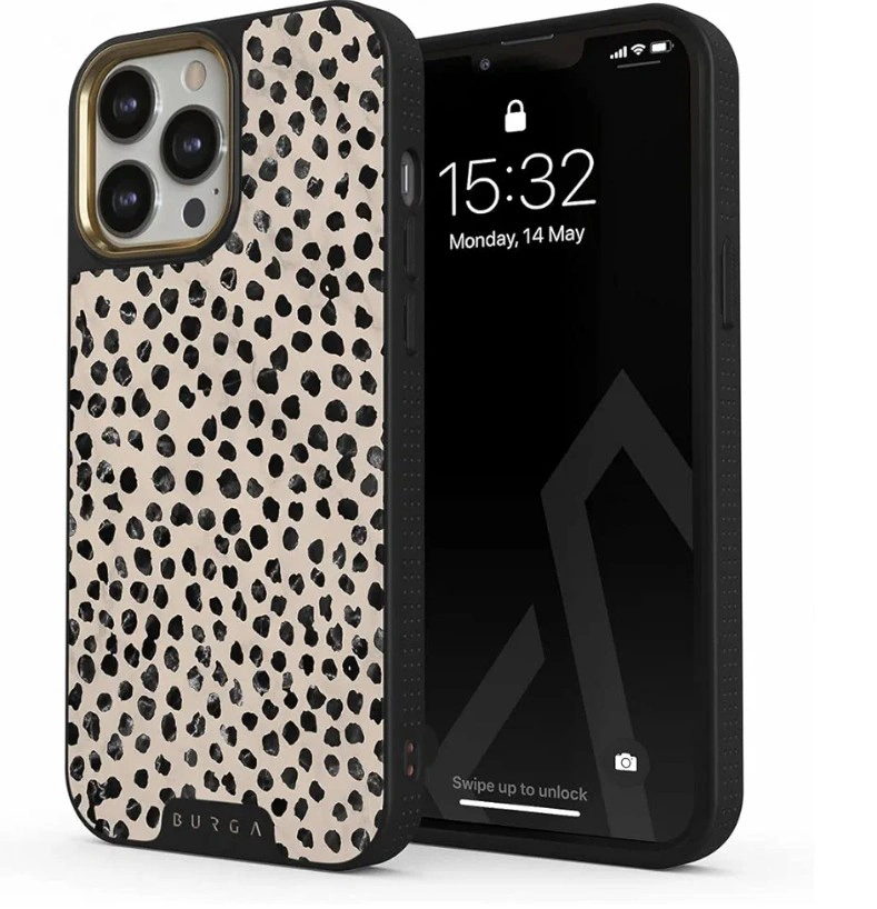 Stylish Burga phone case. Almond Latte Black print. Includes a ring holder. Compatible with iPhone 13 Pro Max.