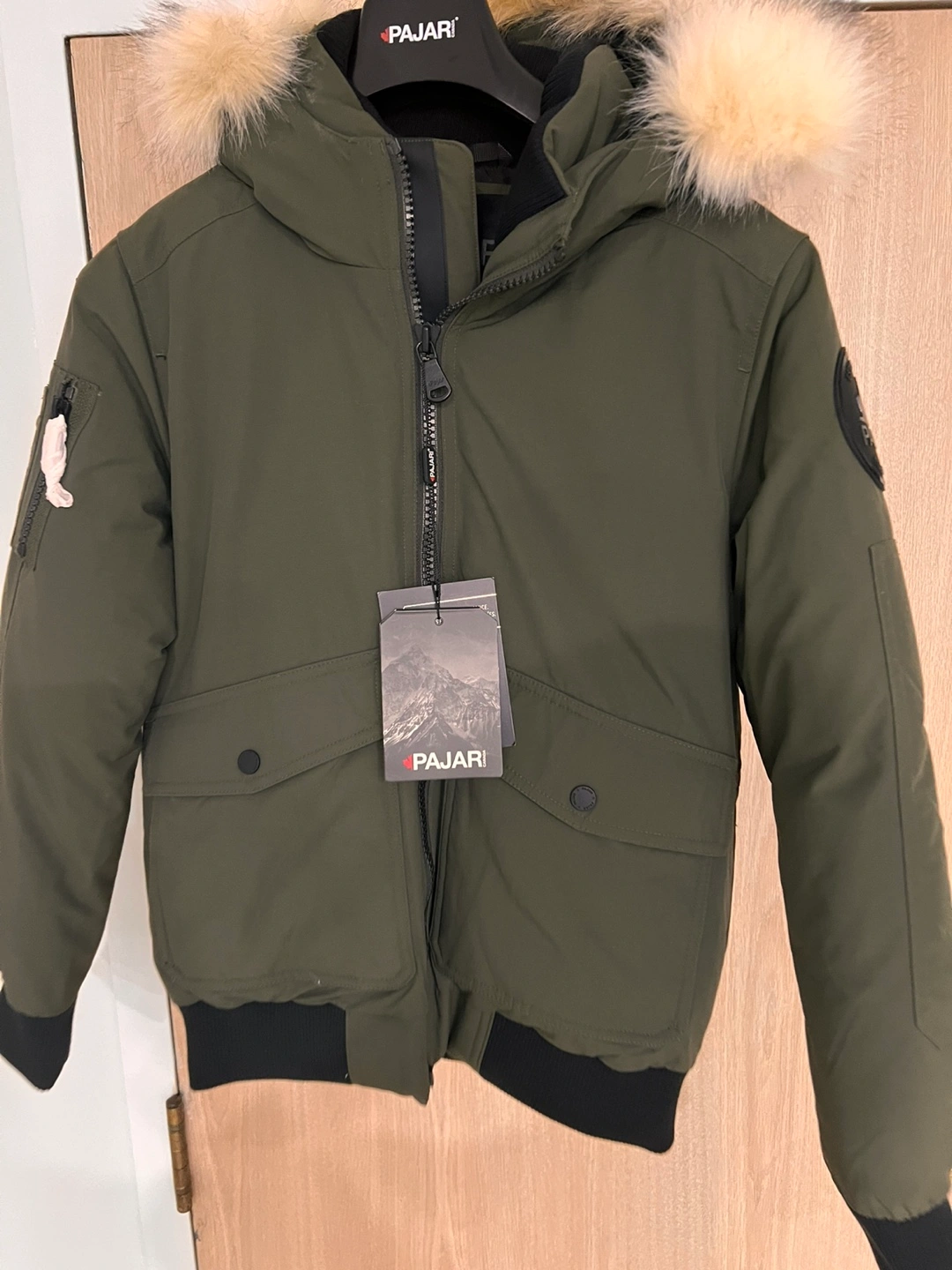 Olive green Pajar kids bomber jacket. Features a faux fur lined hood and ribbed cuffs. Excellent condition. Size 14/16.