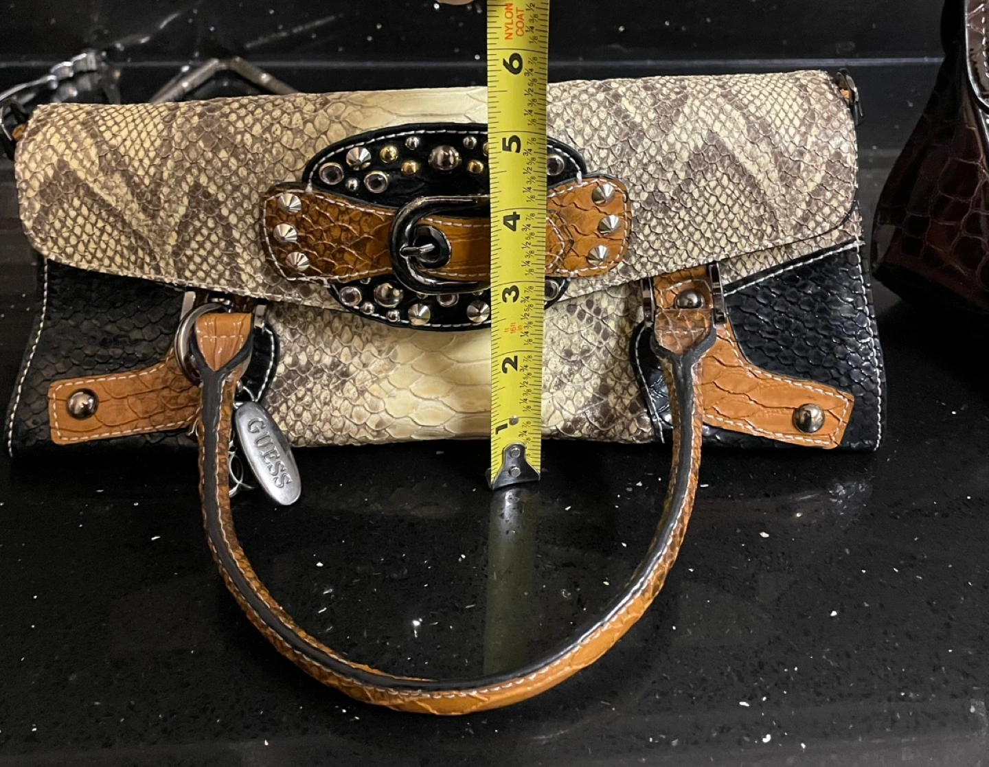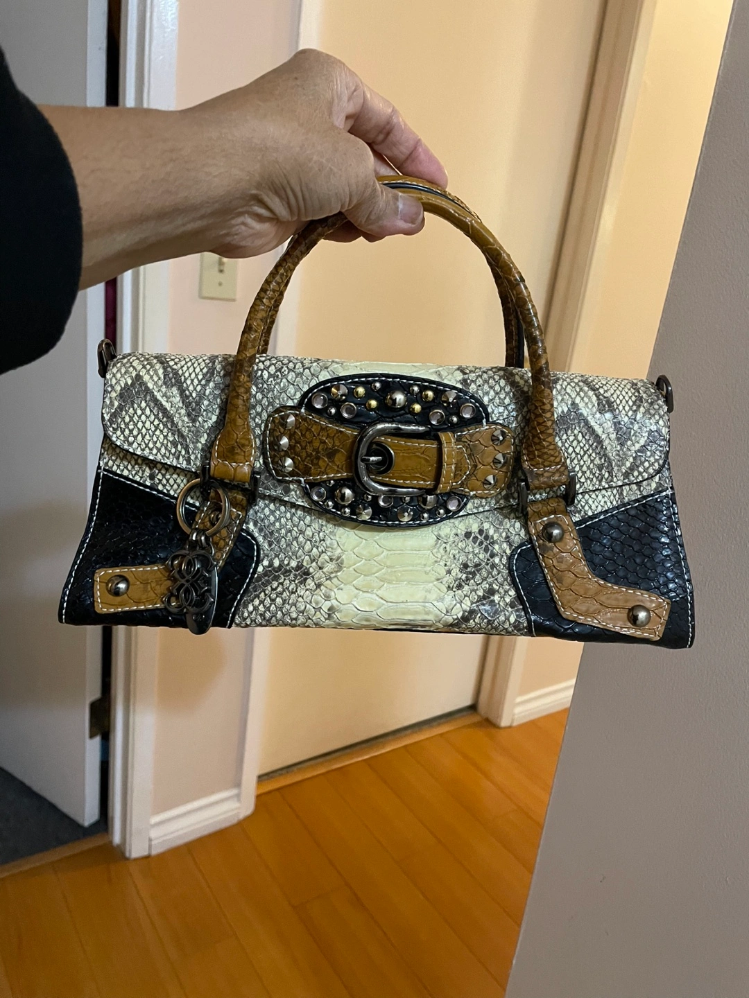 Small Guess handbag. Snakeskin pattern. Tan and black accents. Top handle and No shoulder strap. Metal accents and buckle. Interior lining.