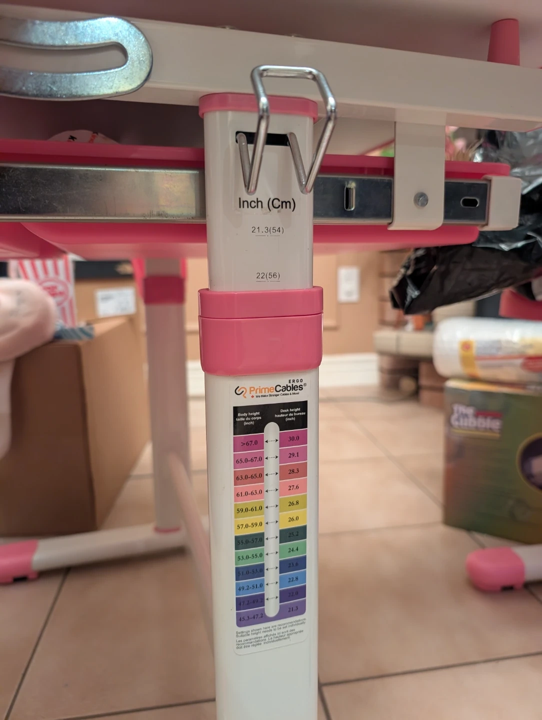 This is a pink adjustable desk and chair set from PrimeCables. It's suitable for children's heights ranging from 45.3 inches to over 67.0 inches. The desk height is adjustable from 21.3 inches to 22 inches.