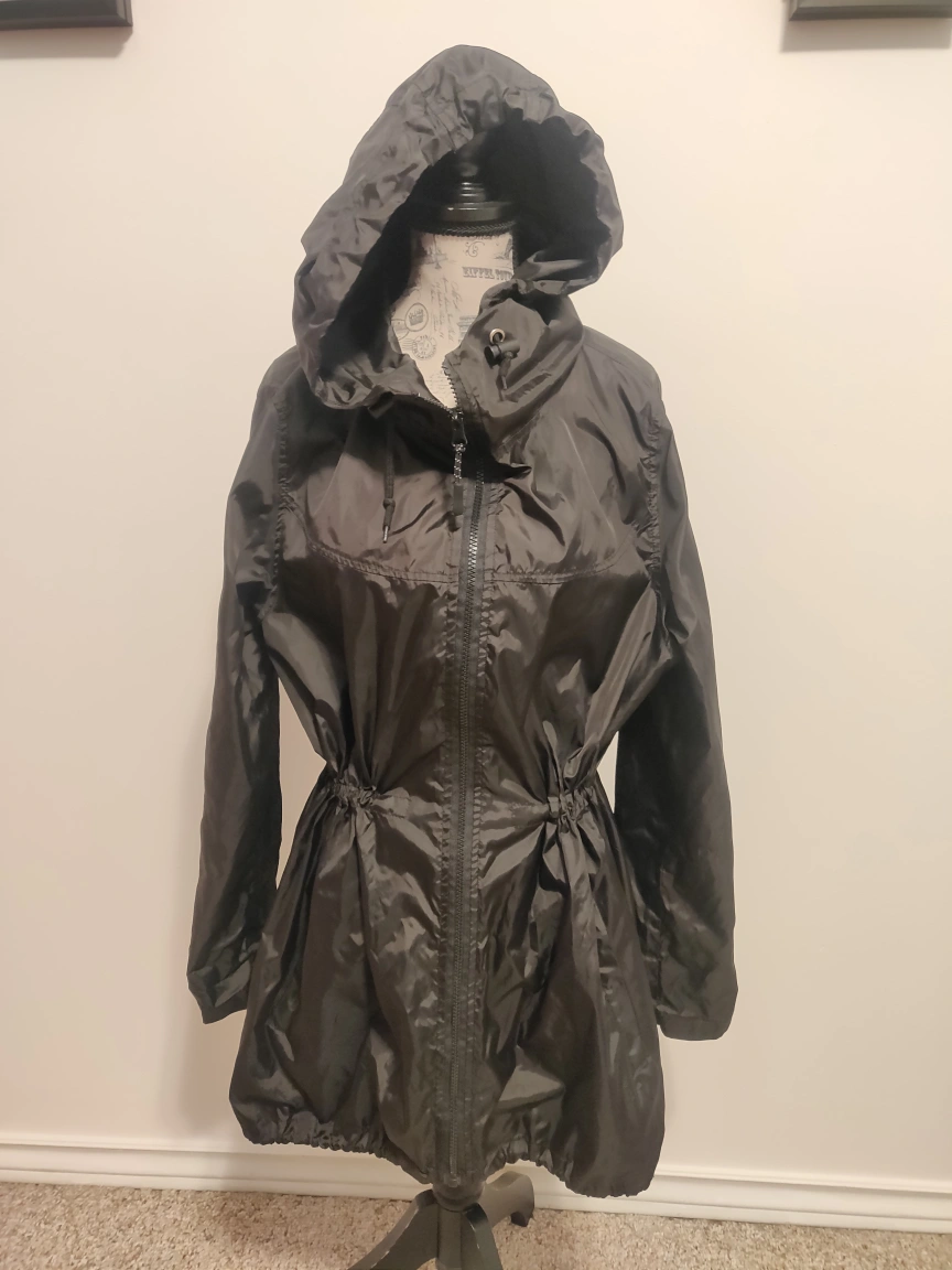 Lightweight black windbreaker/light rain coat. Features a drawstring waist, zip closure, and a hood. Long sleeves with roll-up tabs. Great for layering or wearing on its own. It's still rainy out and this can fold up smaller than an umbrella! 🌧️ ☔
