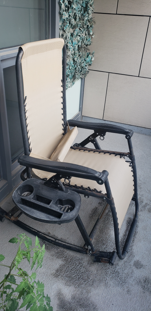 Relaxing outdoor rocking chair. Beige fabric, black frame. Features a convenient side tray with cup holders. Great for patios or balconies.