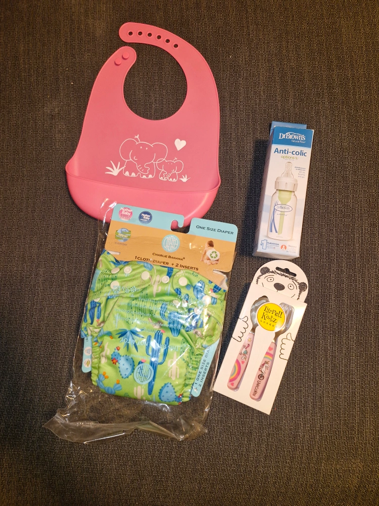 $ 15 for all. Pink silicone bib, Dr Brown's anti-colic bottle 120 ml, Charlie Banana cloth diaper with inserts, and Tyrell Katz baby utensils. Great starter kit. All new. Never used.