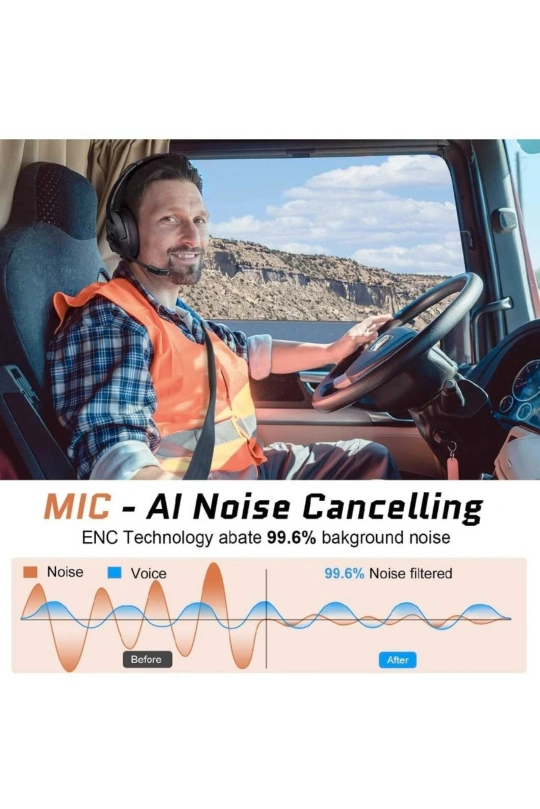 Bluetooth over-ear headphones. AI noise cancelling microphone. 99.6% background noise reduction. Up to 30 hours talk time. 164-foot wireless range. All-day comfort. Mute button.
