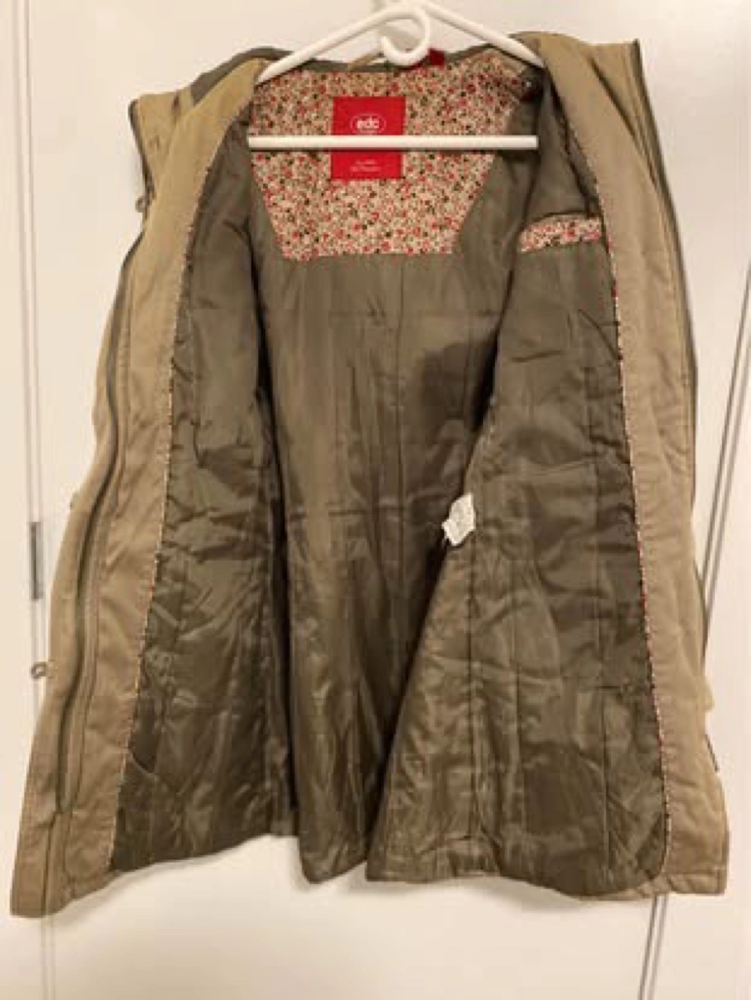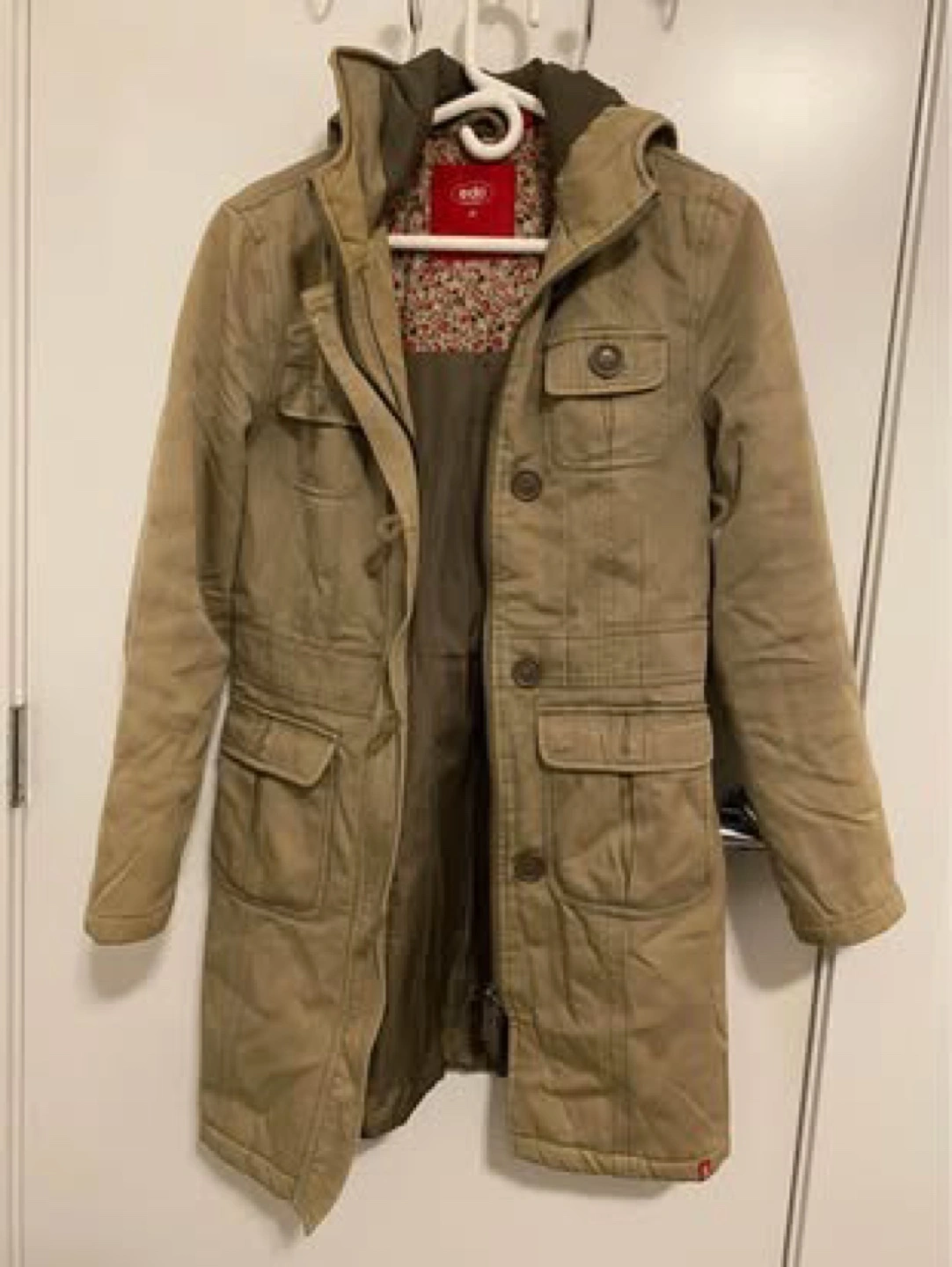 Women's olive green long coat. Size XS. Features a hood and multiple pockets. Good for colder weather.