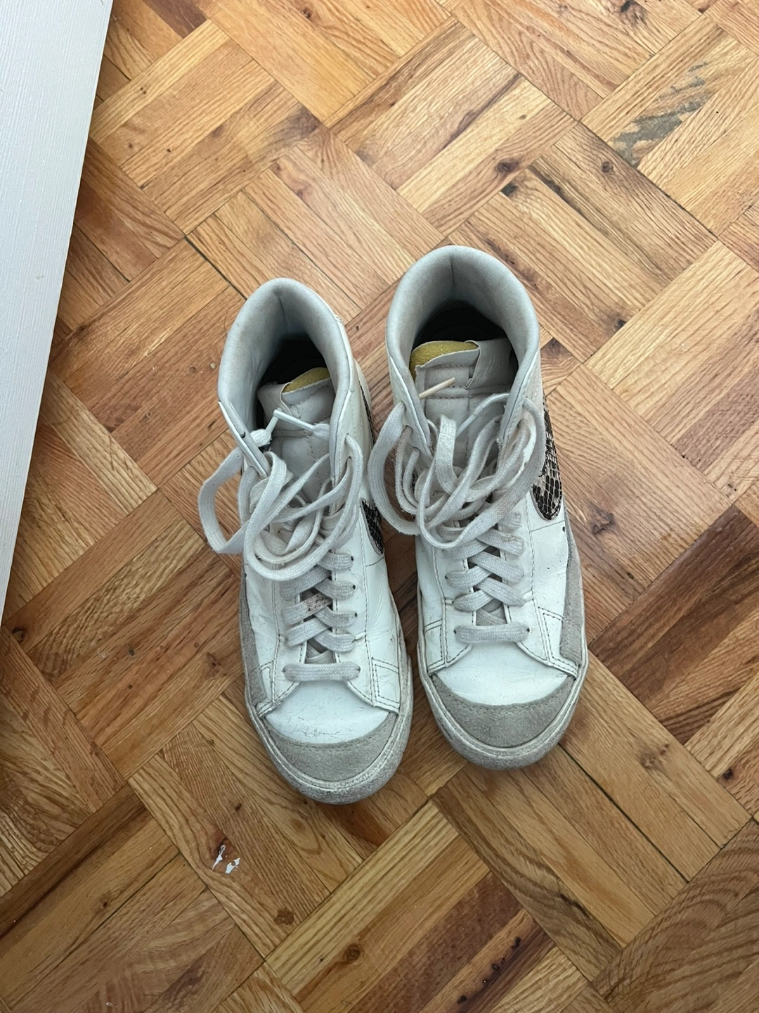 Women's high top sneakers. Off-white leather upper. Snakeskin-textured Nike swoosh. Well-worn, shows signs of wear.