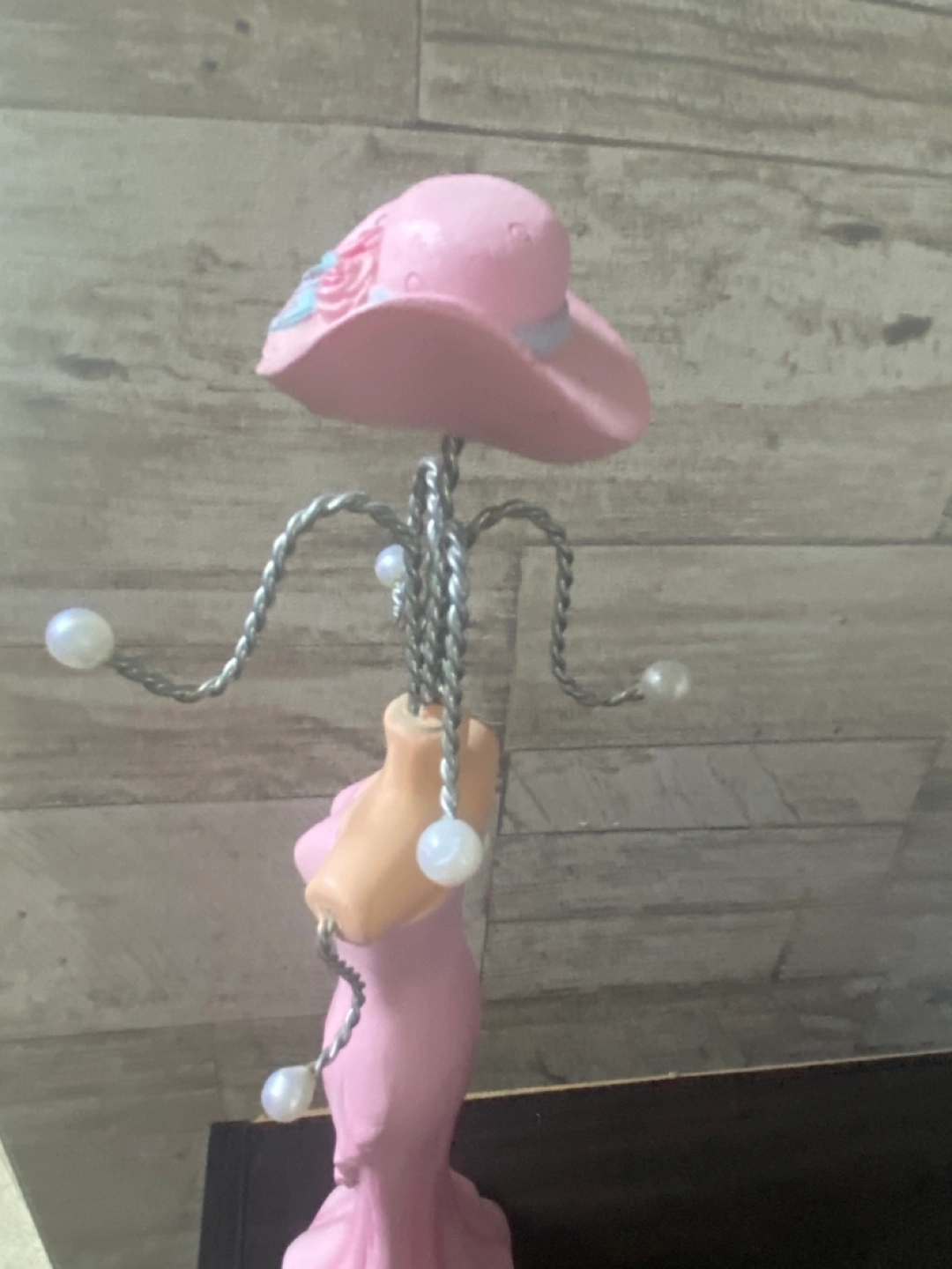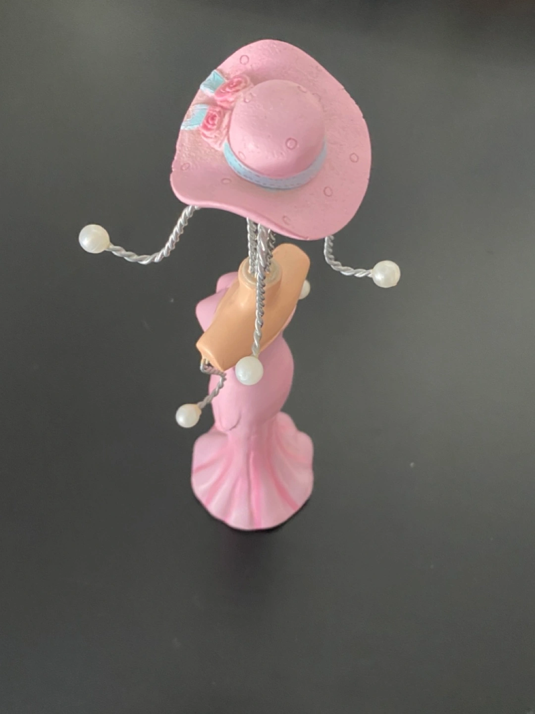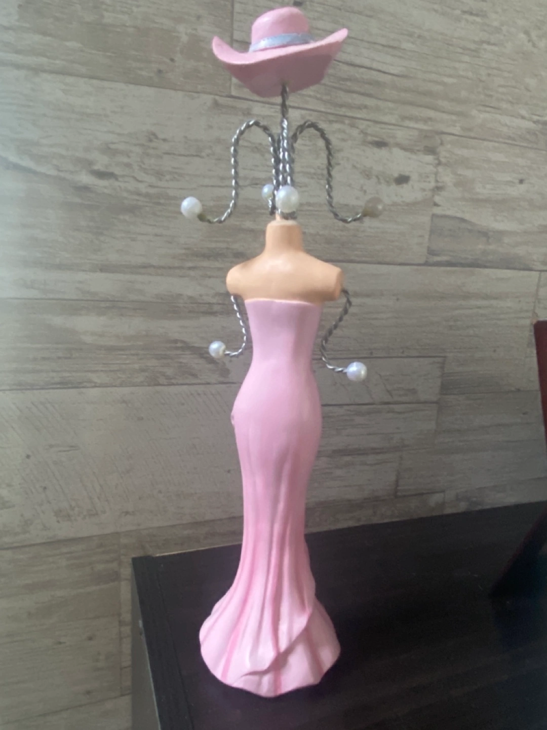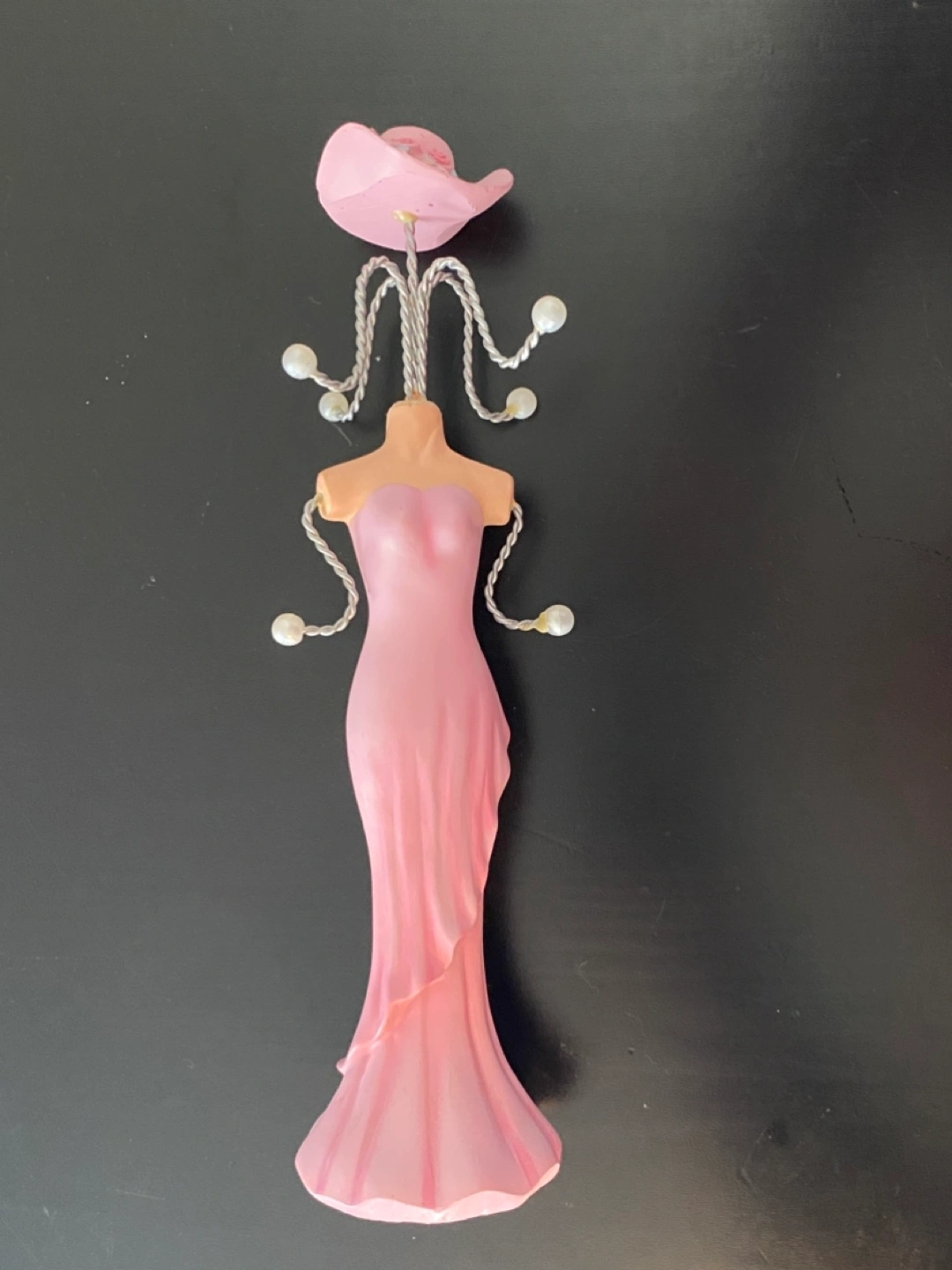 Cute pink dress jewellery holder. Features a metal stand with faux pearl holders and a pink hat. Perfect for storing earrings, necklaces and bracelets.