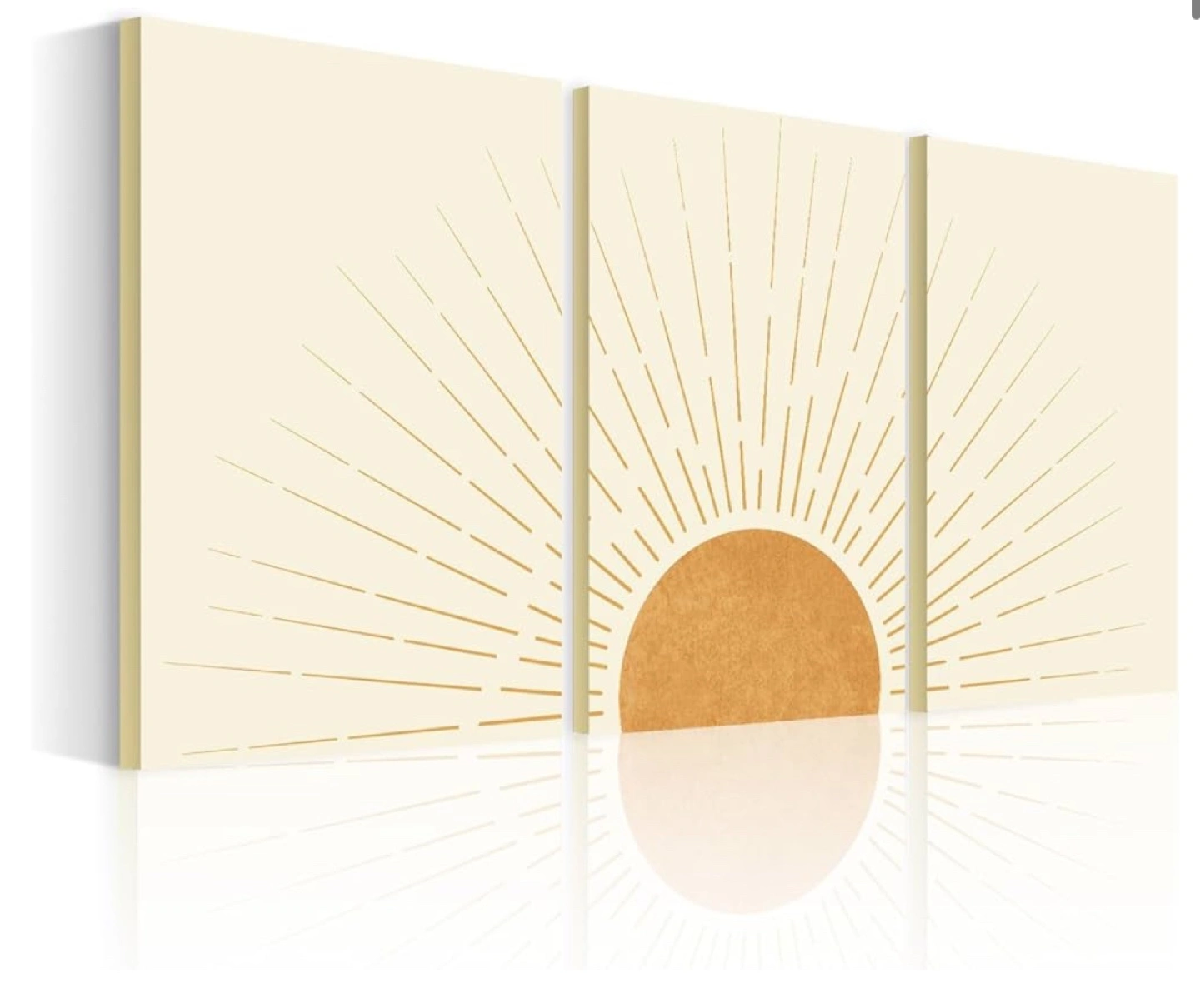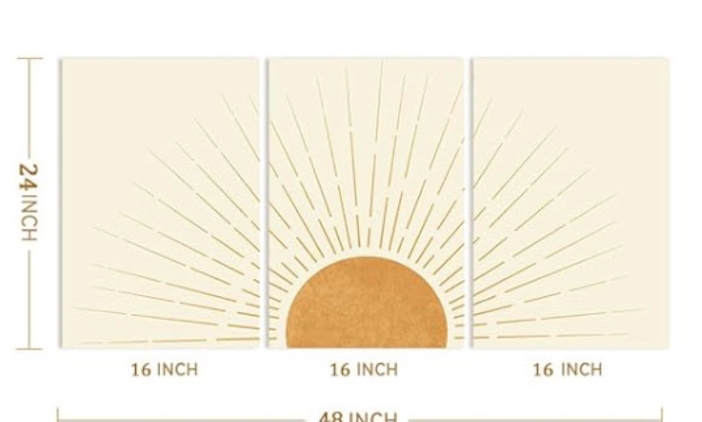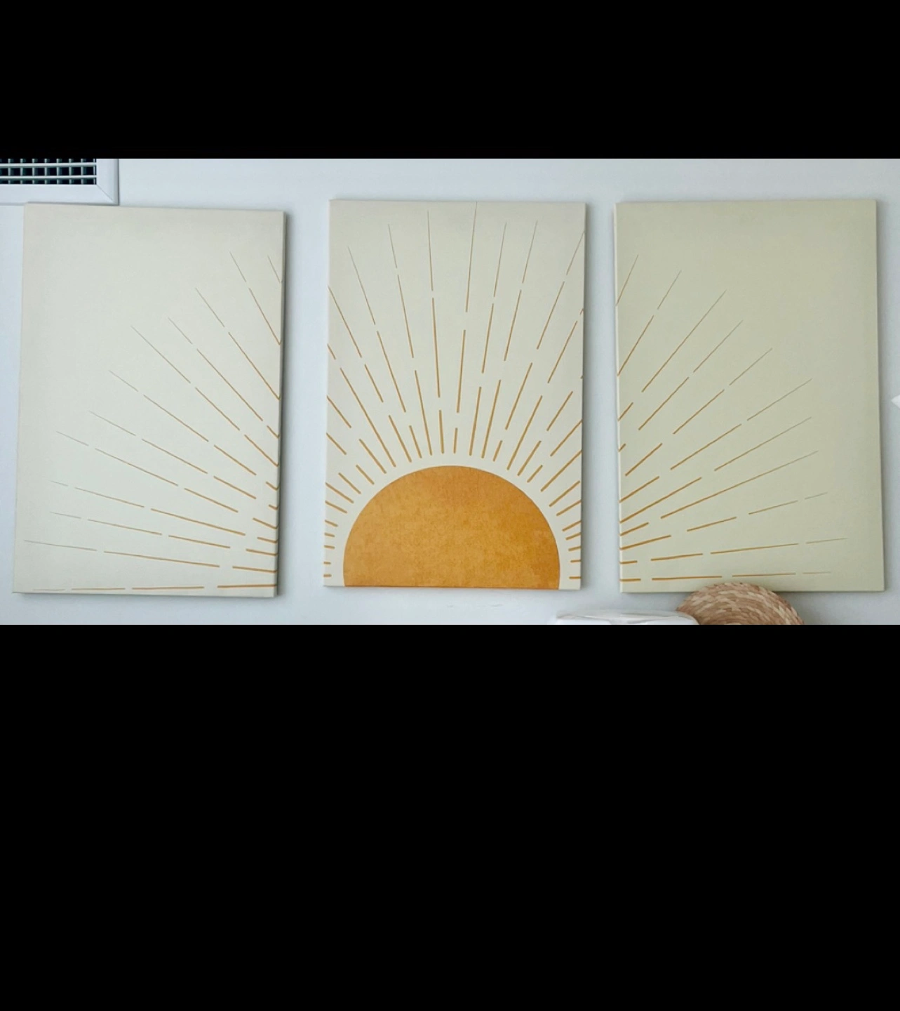 Three-piece canvas set. Minimalist sunburst design. Perfect for modern or bohemian decor. Neutral colors. 16 by 23.5 inch. Completely new still in box, I accidentally purchased two and never returned the second one.