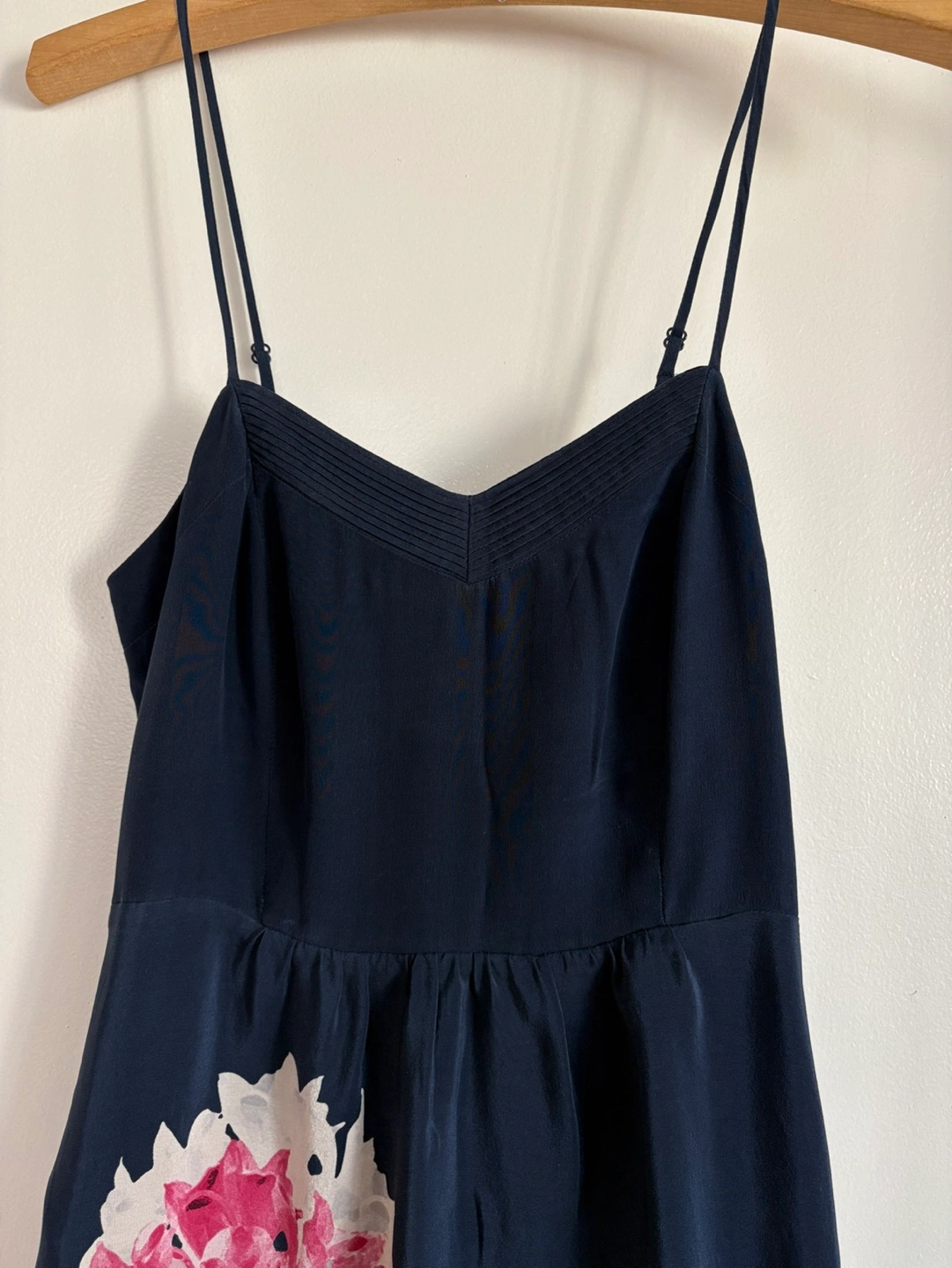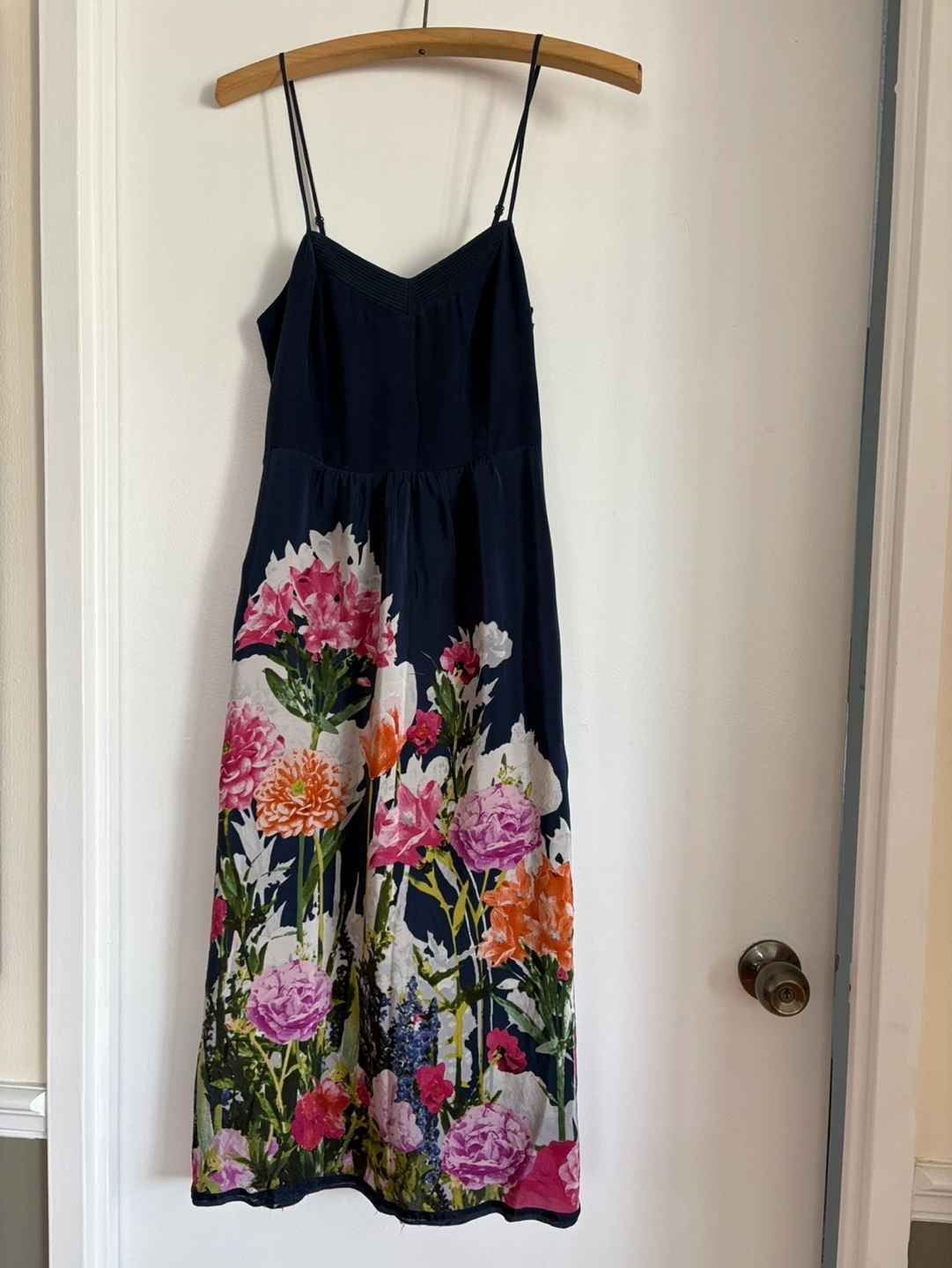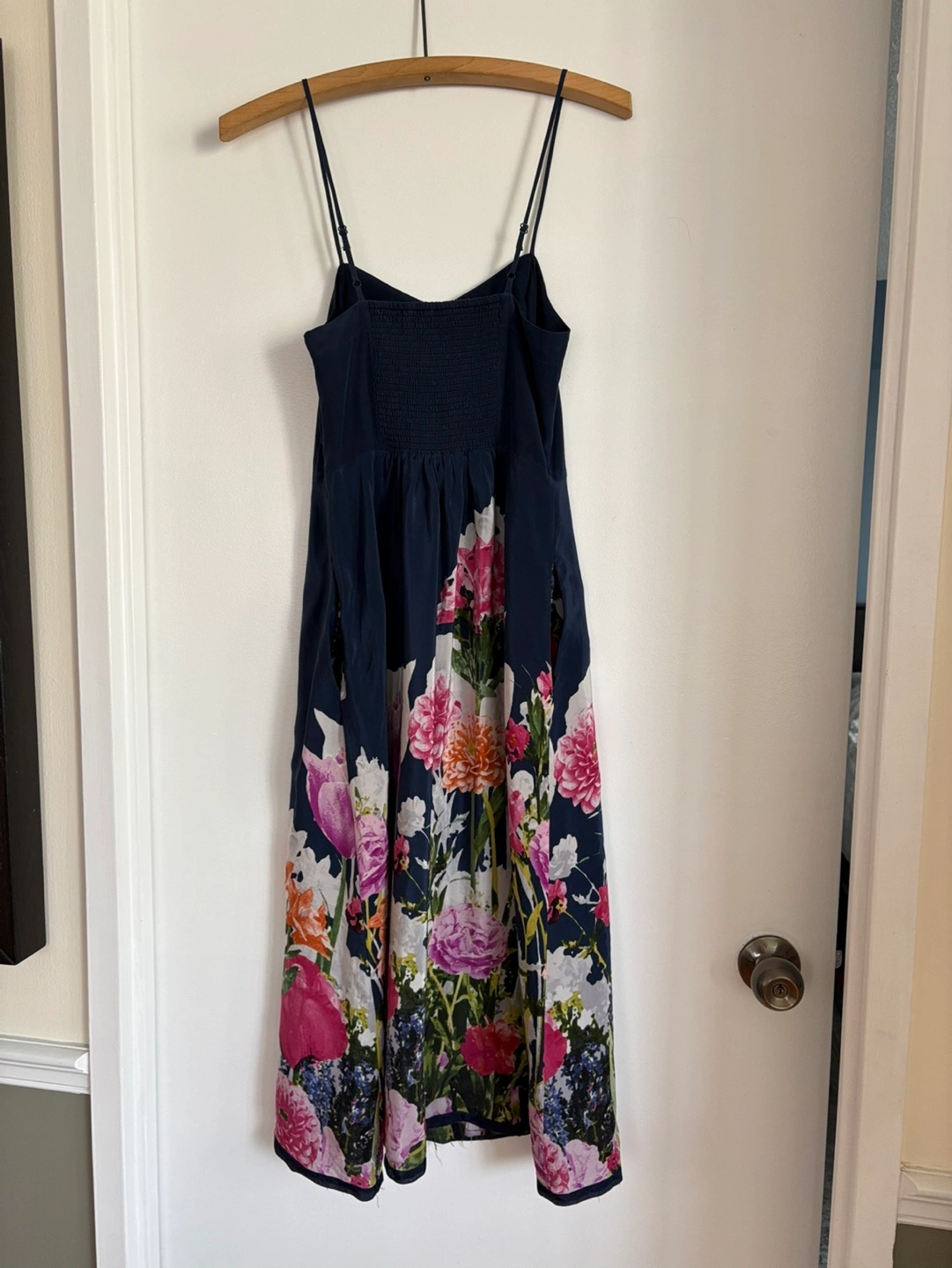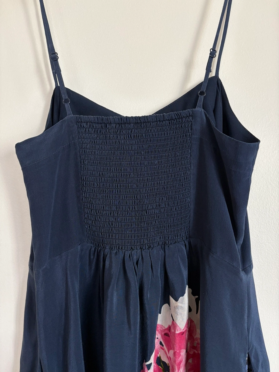 Beautiful navy blue midi dress. Features a floral print and thin shoulder straps. Elasticated back. Side pockets.