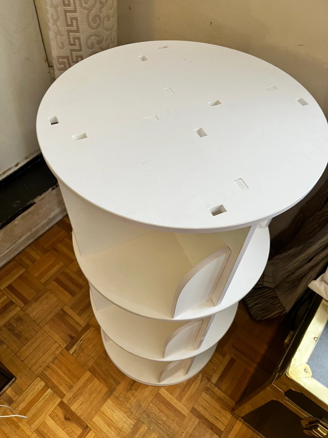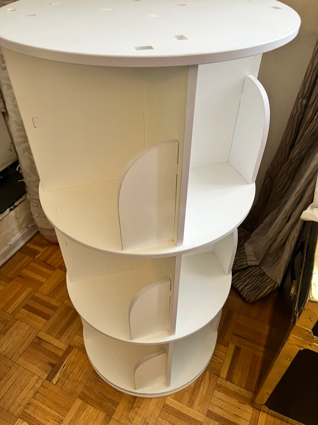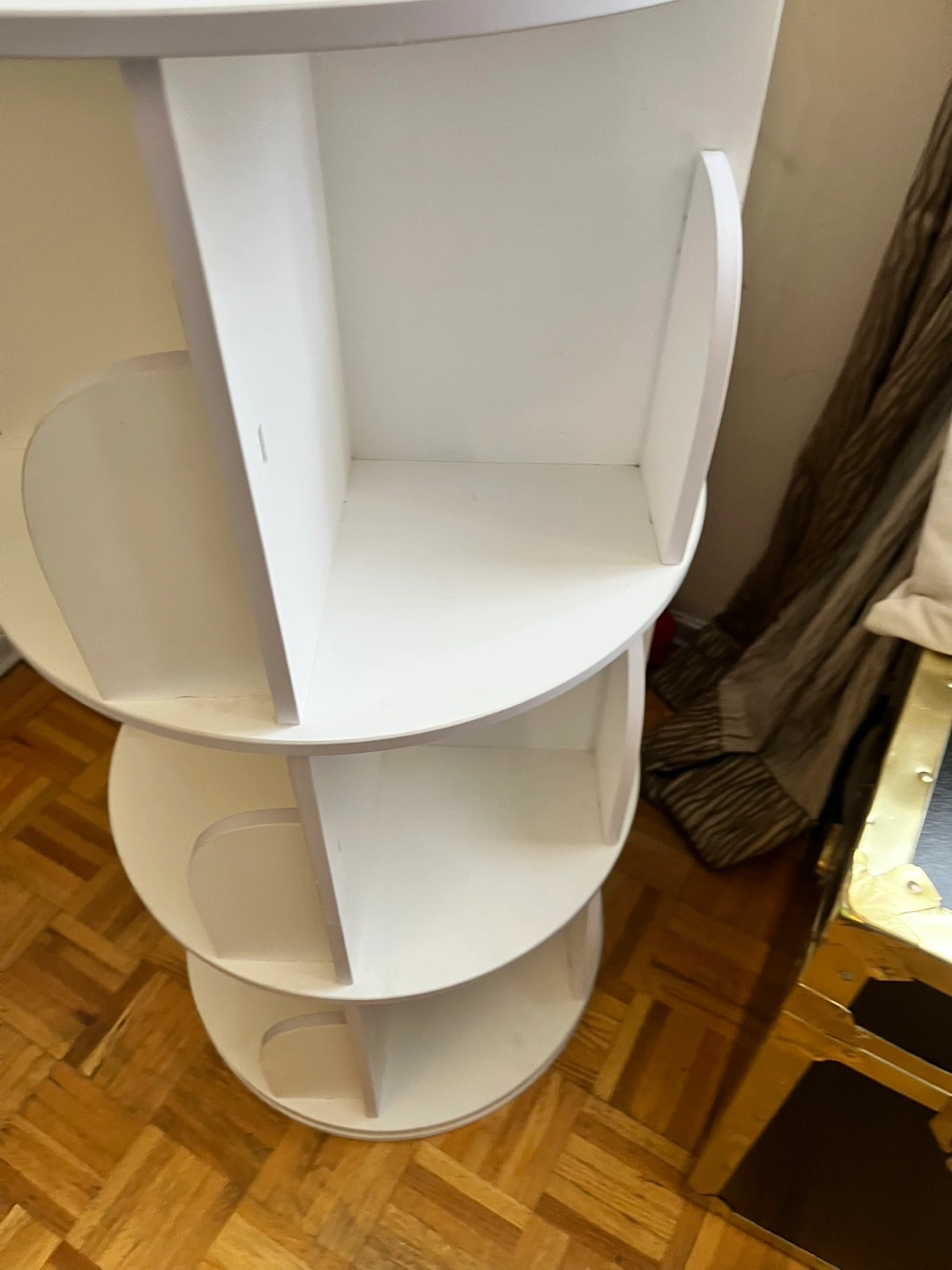 Three-tiered rotating bookcase. White finish. Ideal for books, collectibles, or displaying items. Compact design. Good for smaller spaces. I have 2 more layers extra to extend and make it 5 layer. Comes from pet free smoke free home.