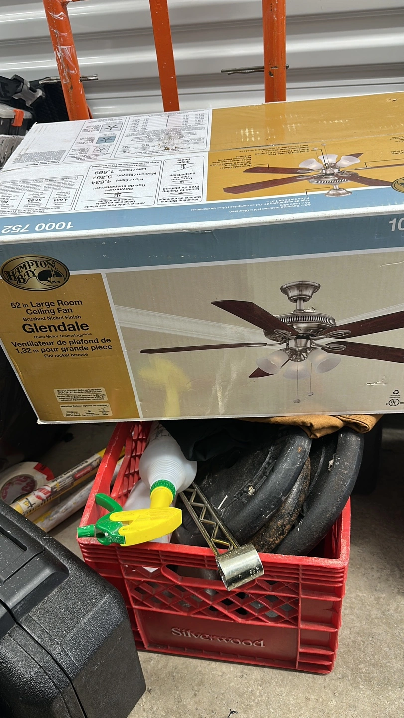 New in box. 52-inch ceiling fan. Brushed nickel finish. Quiet motor technology. Includes light kit.