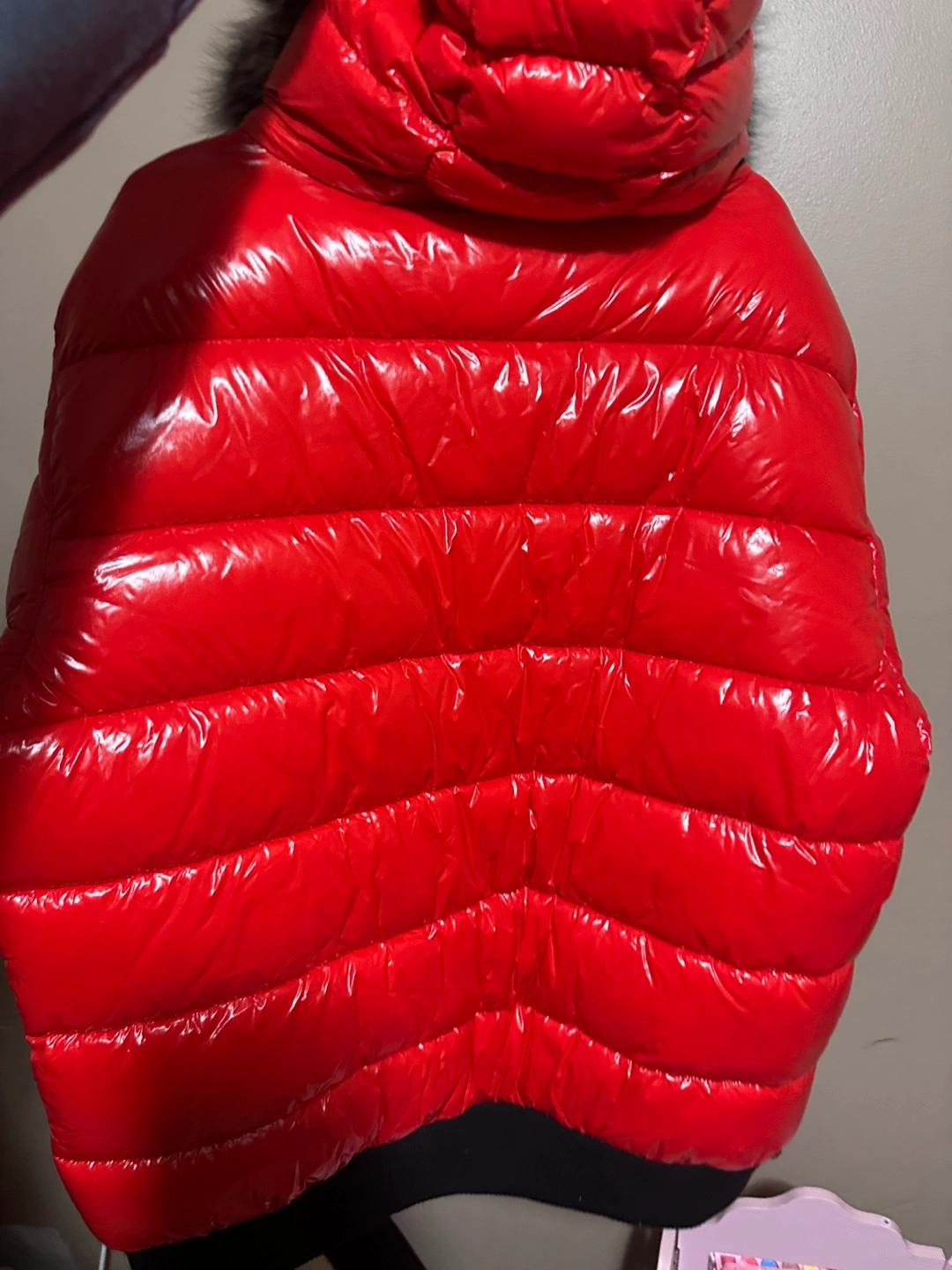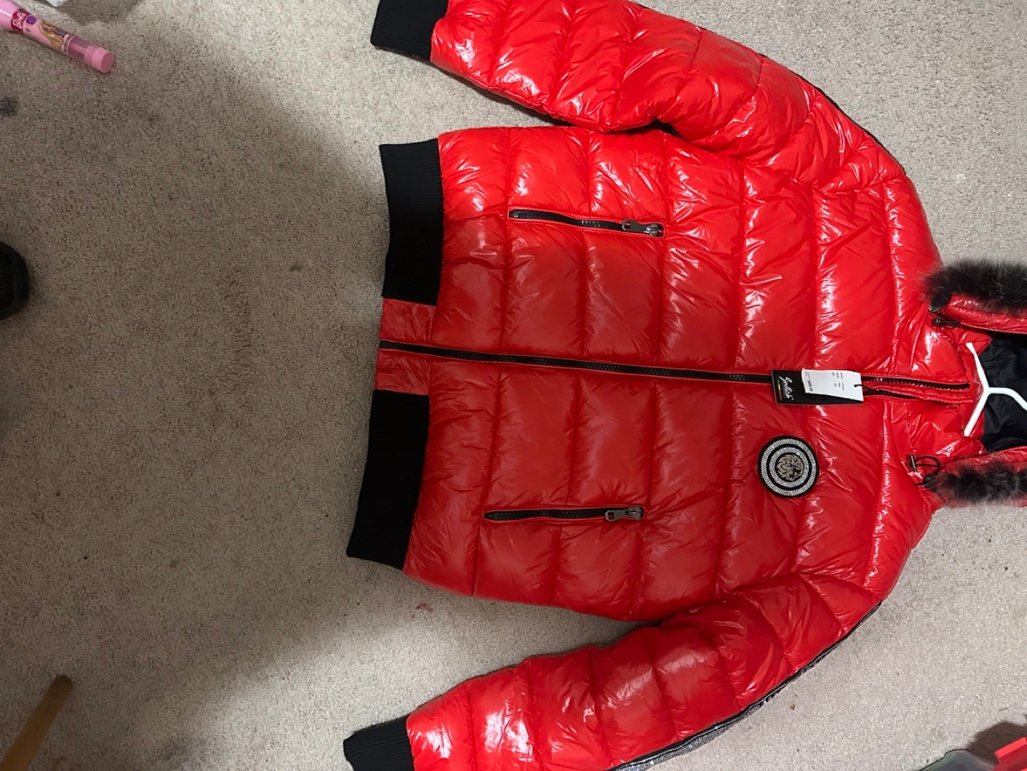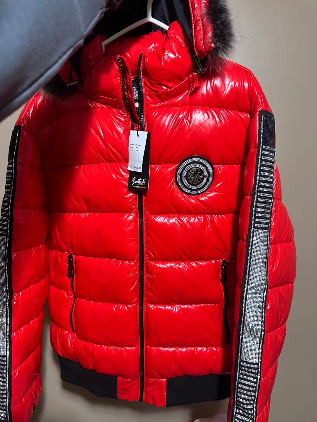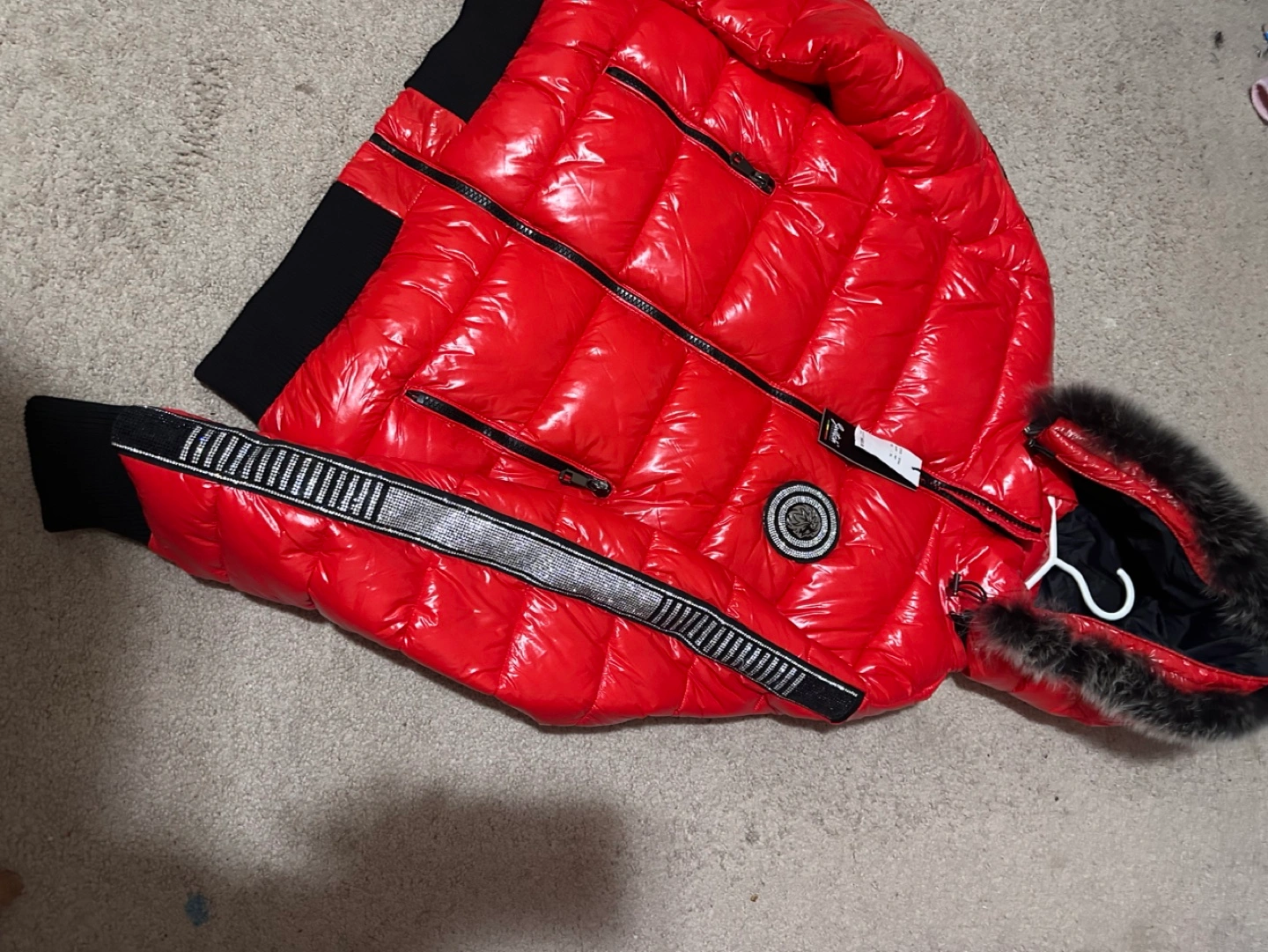 Men's red puffer jacket. Shiny nylon material. Features a faux fur trimmed hood, rhinestone detailing on the sleeves, and a brand logo on the chest. Zipper closure. Size large.