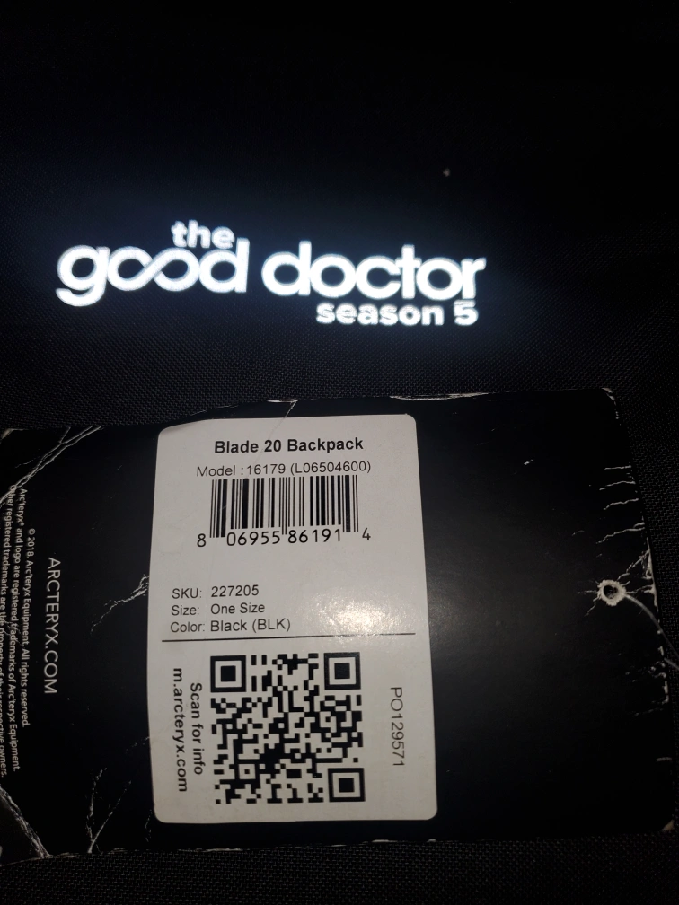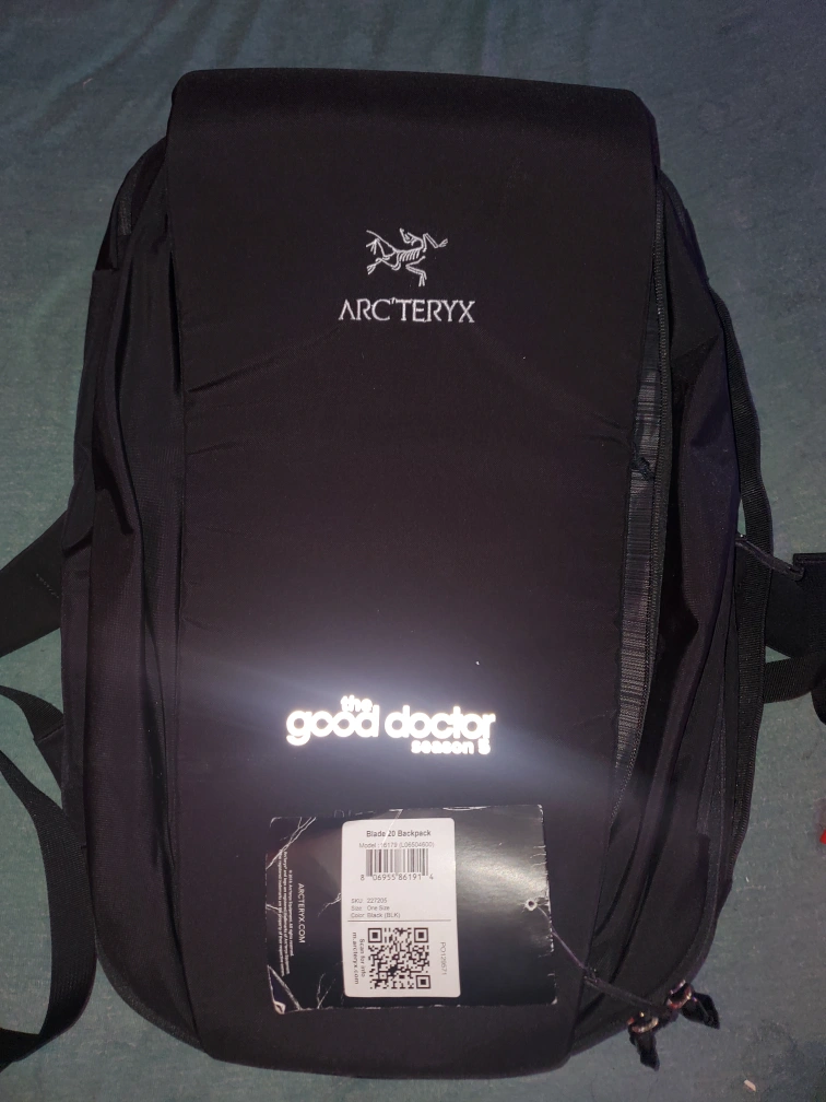 67Arc'teryx Blade 20 backpack. Black. One size. Good Doctor Season 5 promotional item. Reflective logo.