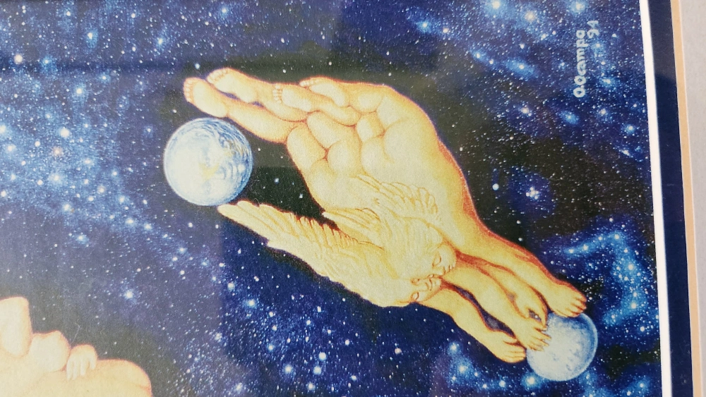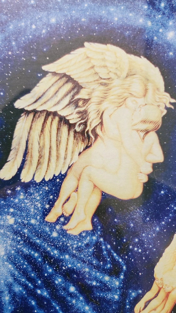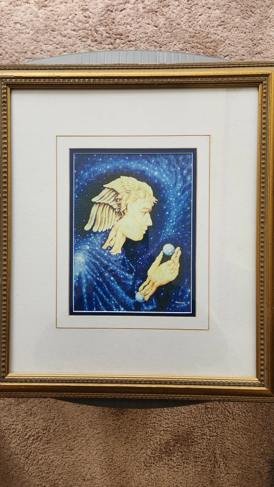 Beautiful art print featuring celestial beings in a cosmic background. multiple images in one large image. Unique, one-of-a-kind piece.