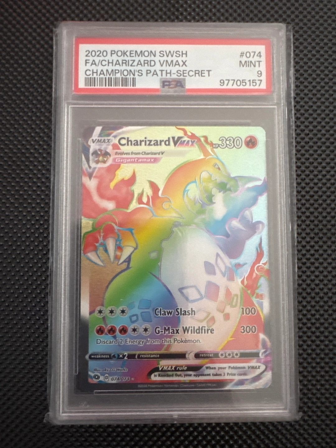 2020 Pokemon Sword & Shield Champion's Path Secret Rare Charizard VMAX. Graded PSA 9 Mint condition. #074/073