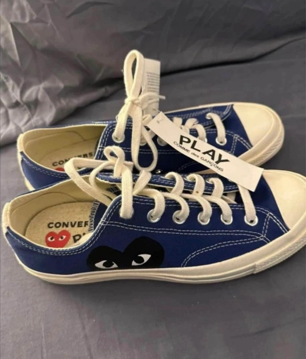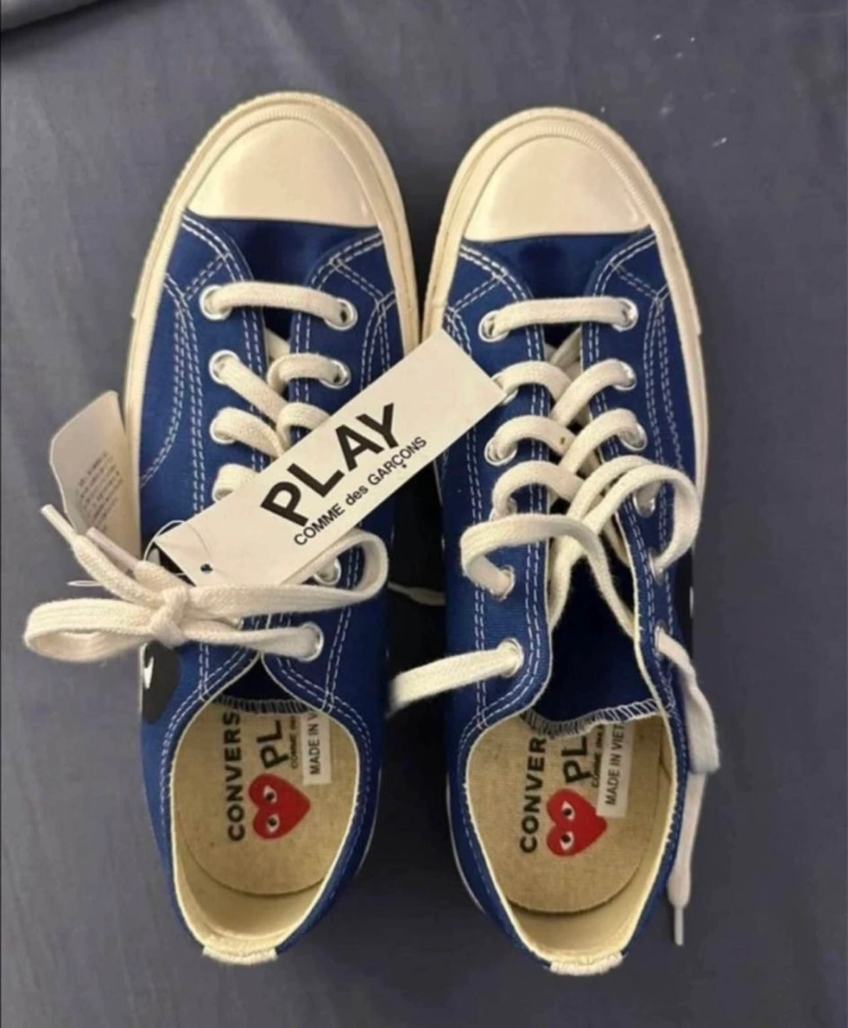 Blue canvas sneakers. Comme des Garcons Play heart logo. Classic Chuck Taylor style. Made in Vietnam. Doesn’t include box