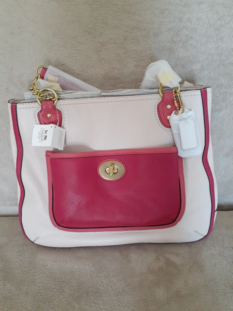Available! Brand new Beautiful Coach tote bag. Two-toned design in pink and beige pebbled leather. Features gold-tone hardware with interior zippered pocket and slip pockets. Comes with dust bag. Retails for $348 plus tax. Please refer to all photos. I don't send people low balls offer and appreciate not receiving them. Thanks for looking. Cash and porch pickup close to Willowdale Middle school or North York Center Station./ Empress Walk