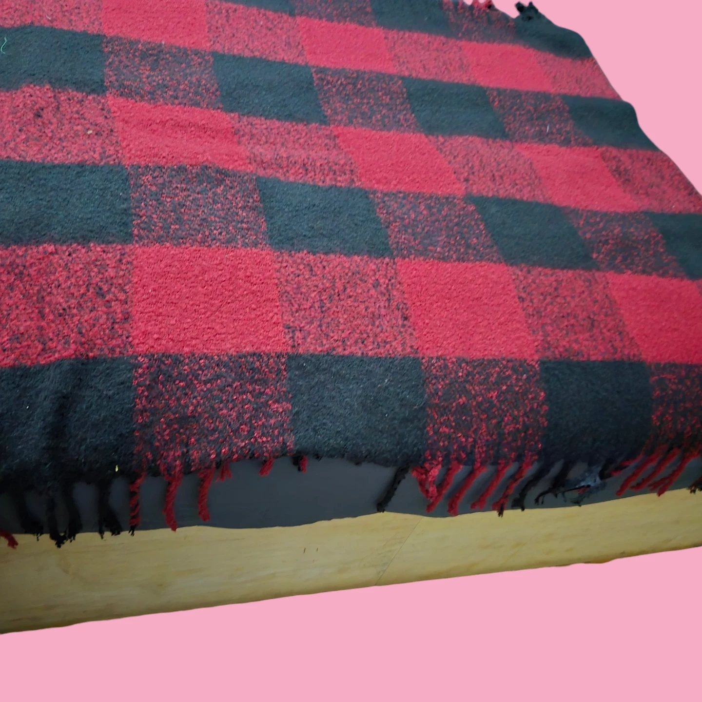 This is a cozy throw blanket with a classic red and black plaid pattern. It's perfect for adding a touch of warmth and style to your home. The blanket features fringed edges, adding to its charm and texture.