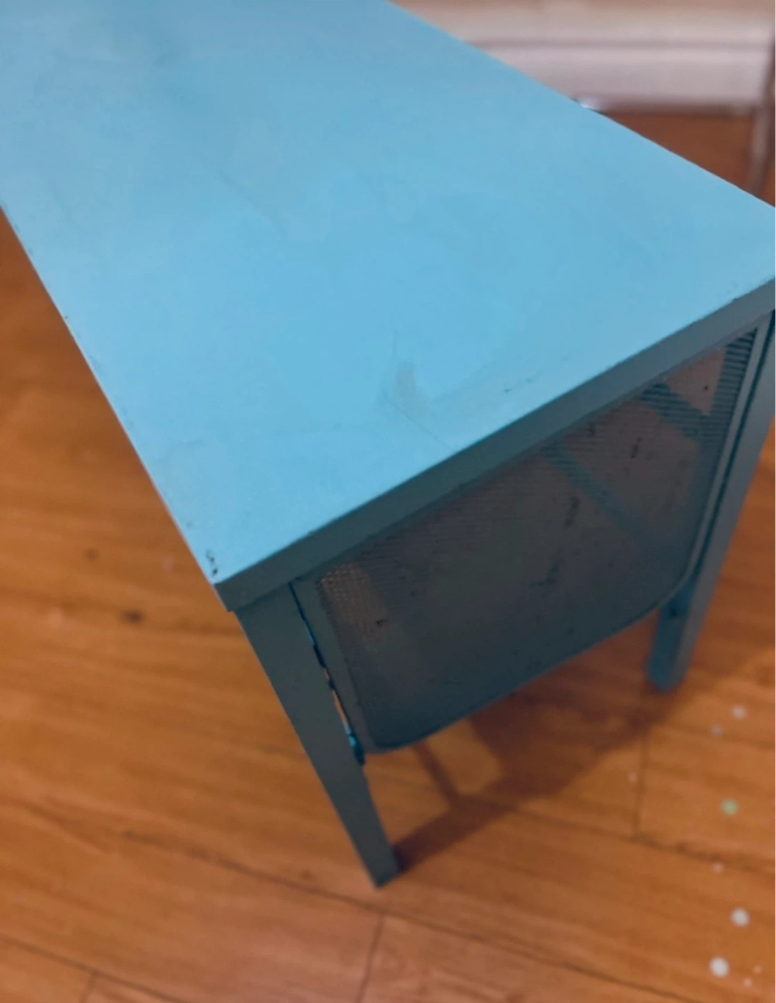 Fast pickup pls we are downsizing having just moved - This is a blue, two-tiered Ikea outdoor bench with a metal mesh sides. The bench is made of metal with a blue metal paint that is water & rust proof. Its dimensions are roughly 48 inches long and 16 inches high. The top can come off easily. Great for extra seating or display of outdoor plants etc
