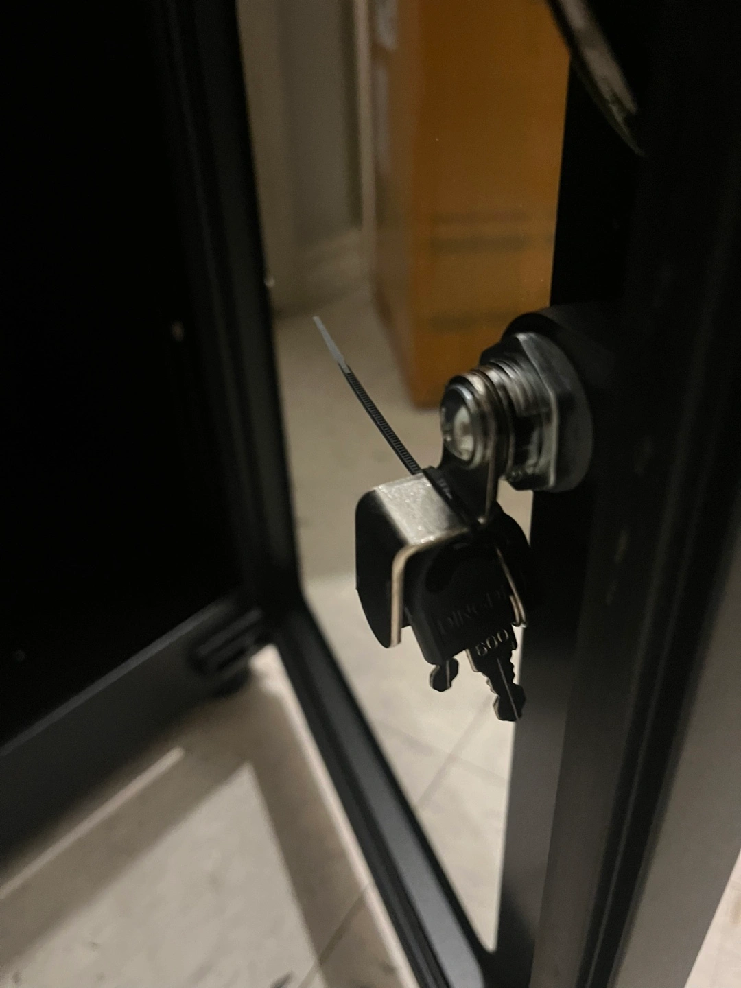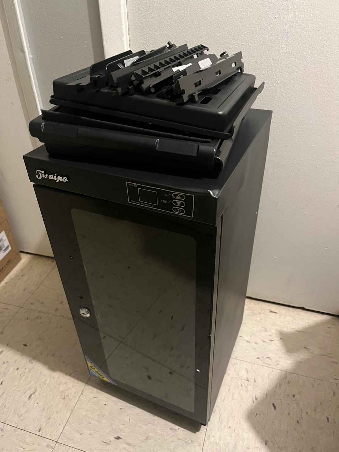 Black electronic Dehumidifying cabinet with glass door and lock with 2 keys. Features digital controls, steady hydrostat, LED lighting, and 4 adjustable shelves with foam matting.
