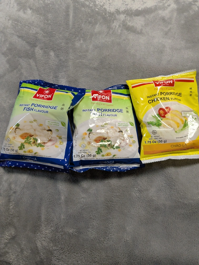 741Three packets of instant porridge. Chicken, Fish, and chicken flavour. Each 1.75 oz (50g) Pick up at 66 Wellington Street west