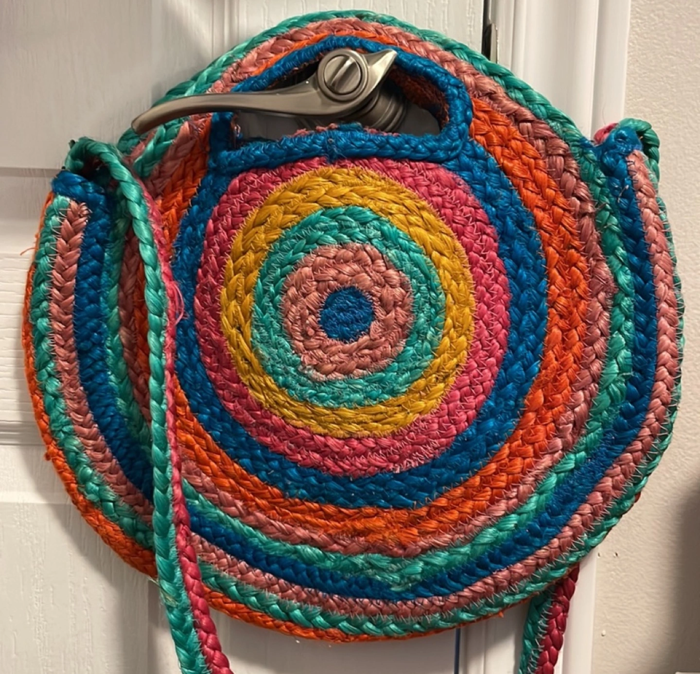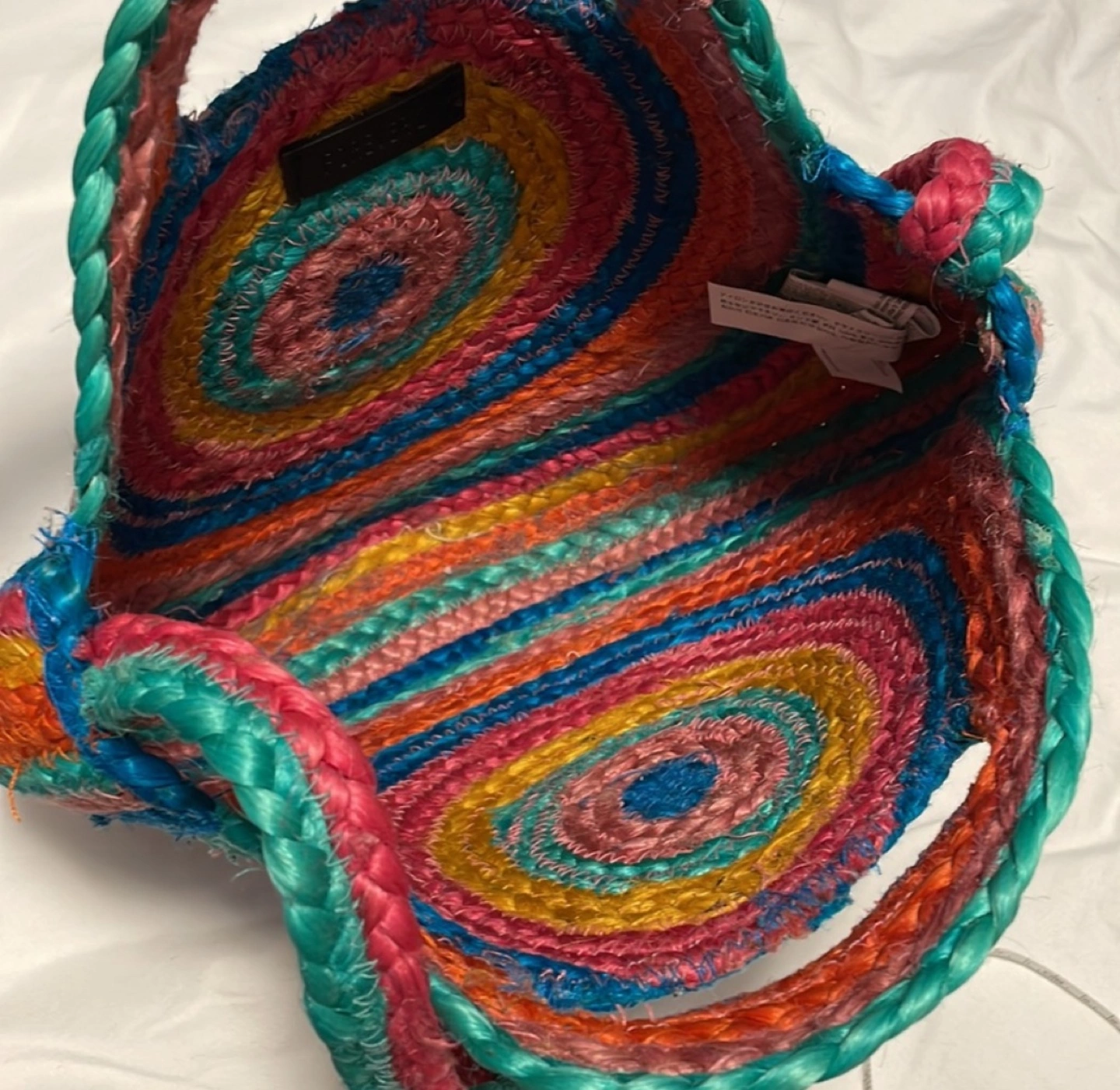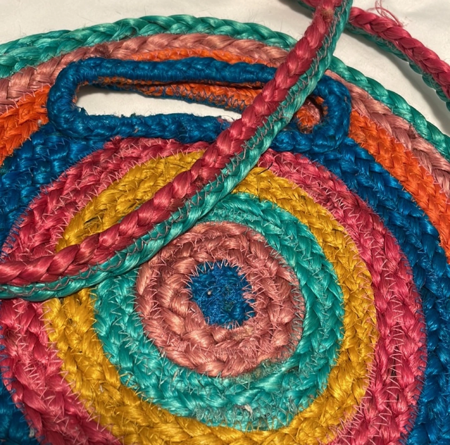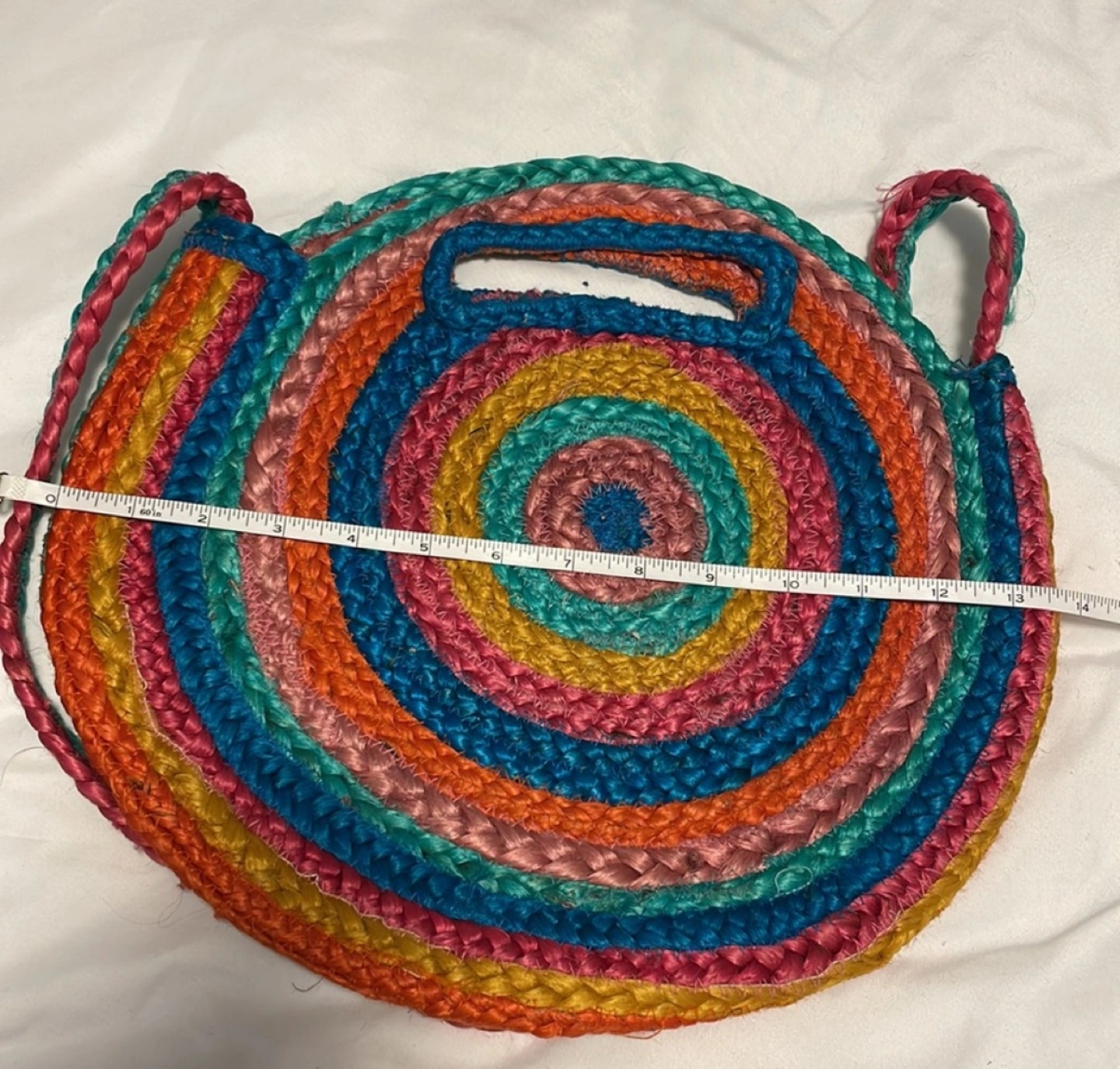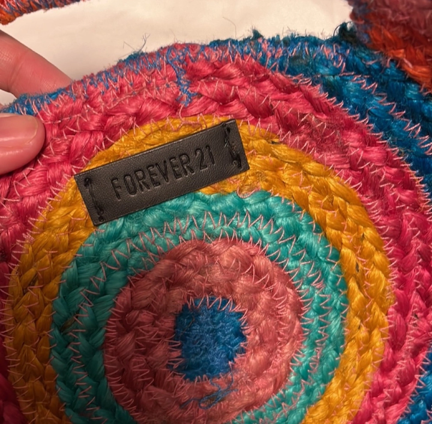 Forever 21, Preloved round rattan colorful bag. Perfect for your summer getaway. Used only a couple of times. Please refer to images for measurements. Shoulder strap measures about 36inches in total (36/2, 18 inches when you wear it). No major flaws to mention, only minimal signs of wear.