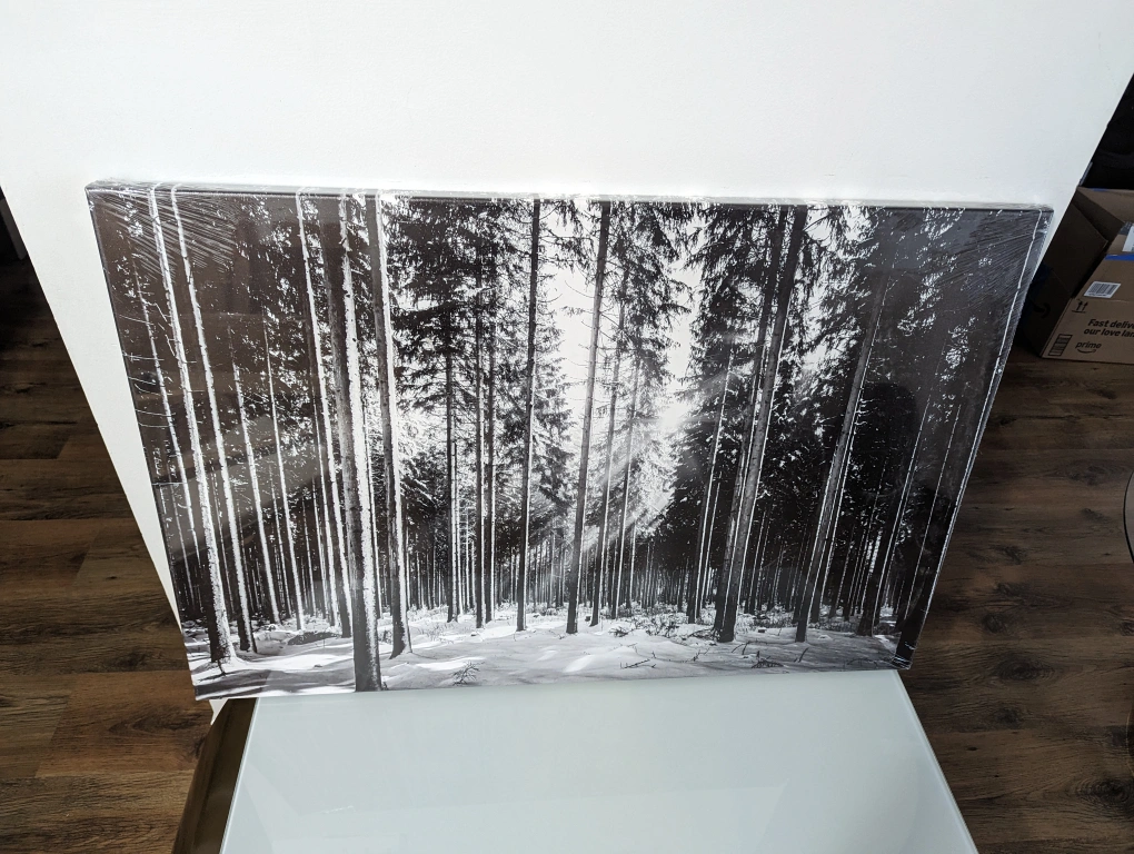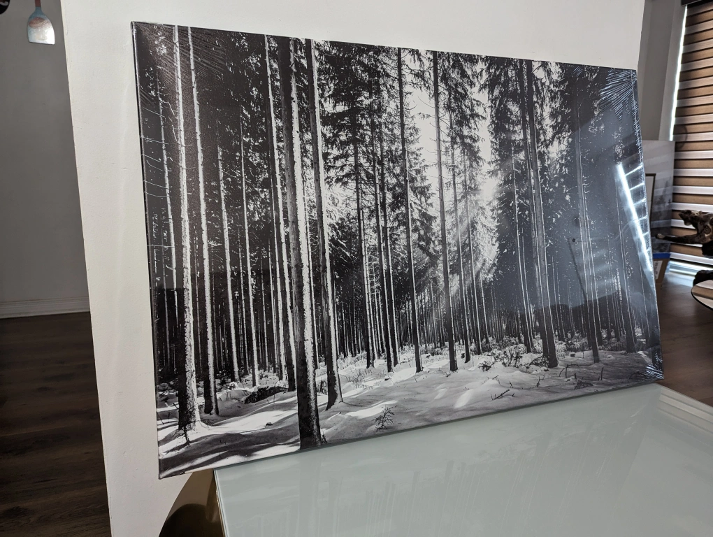 Stunning black and white canvas print. Depicts a snowy forest scene. New in plastic wrap.