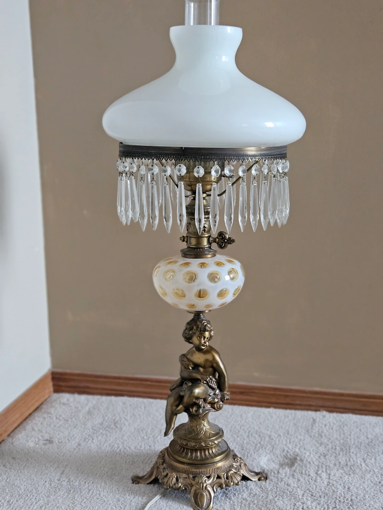 Beautiful antique-style table lamp. Features a cherub base, milk glass shade, and crystal accents. Elegant and ornate design. 32" tall, excellent condition. $80.⁰⁰ Ph. 204-612-7831.