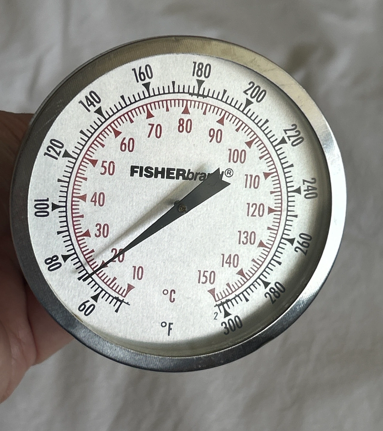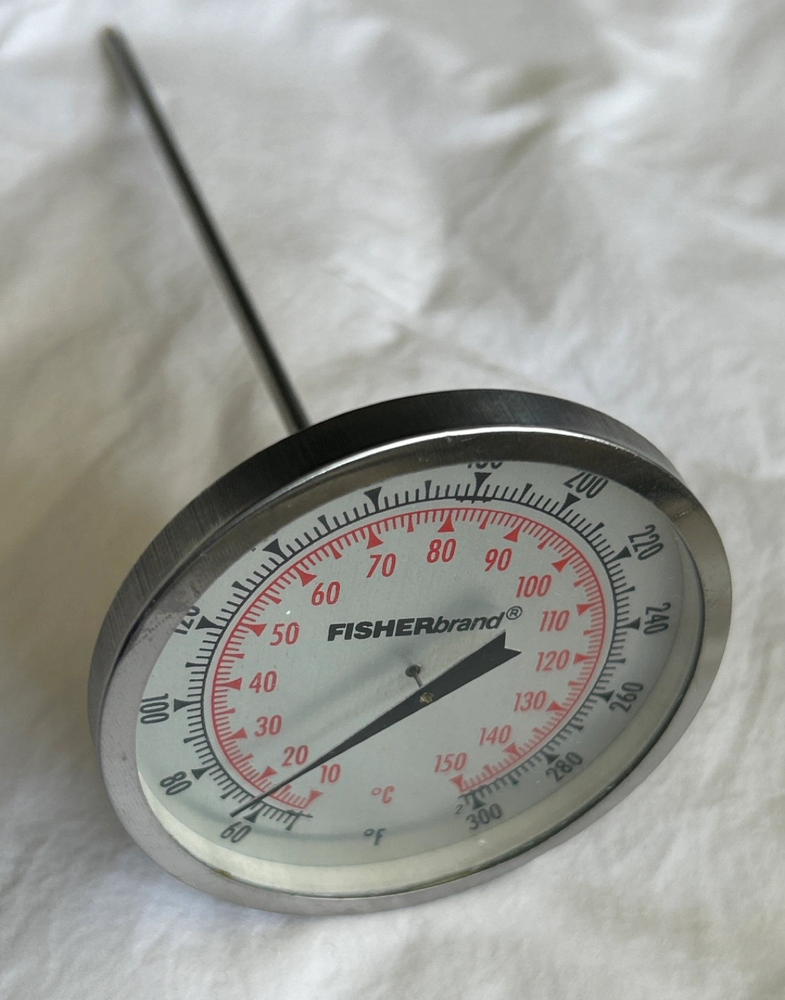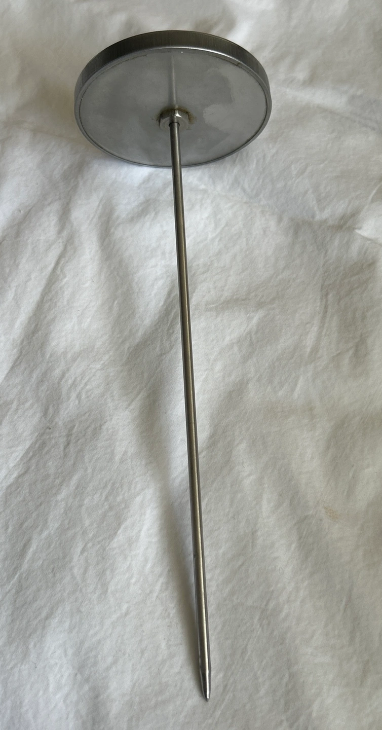 Stainless steel oven thermometer. Measures temperature in Celsius and Fahrenheit. Long probe for accurate readings. Good condition and clean.