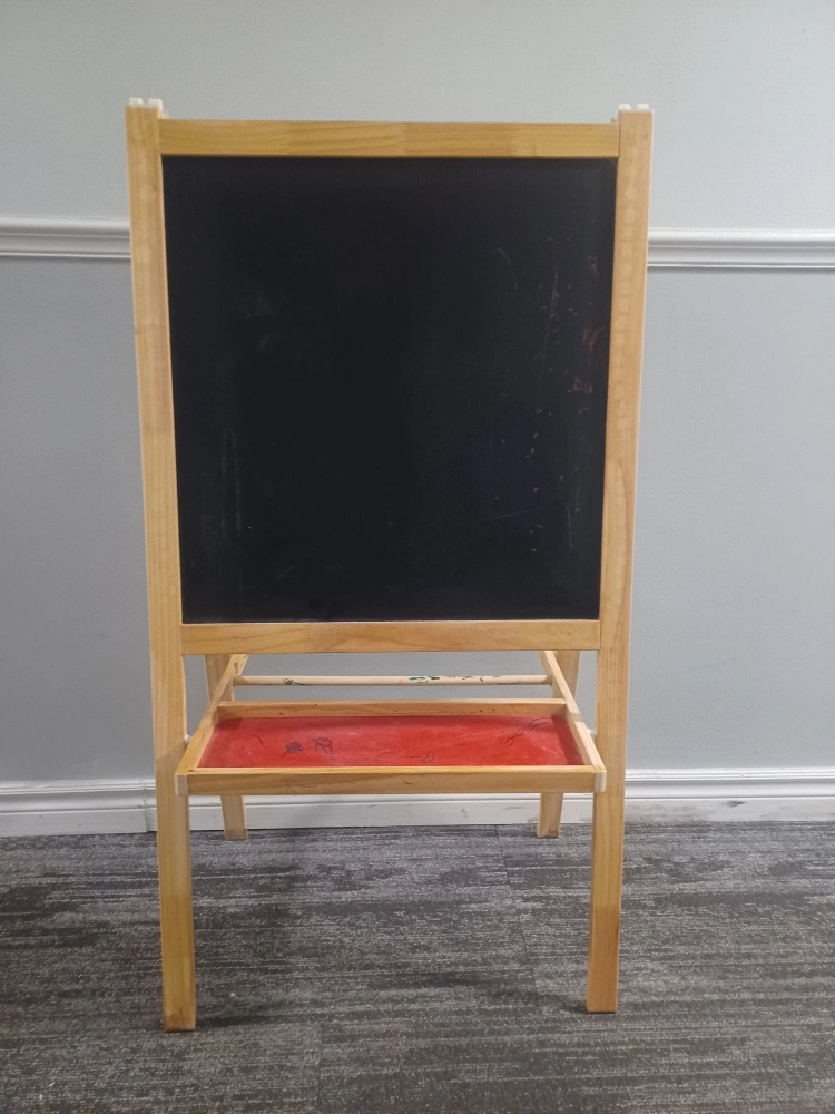 229Portable children's easel. Features a whiteboard and chalkboard. Includes a small tray for storing art supplies. Wooden construction. Good for home or classroom use. used and in good condition. NOTE: It has few traces of permanent markers dents.
