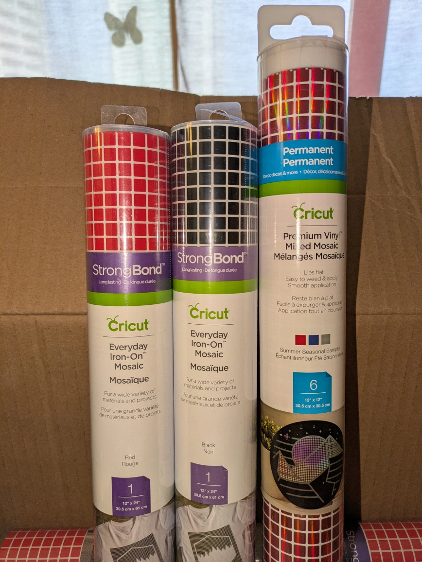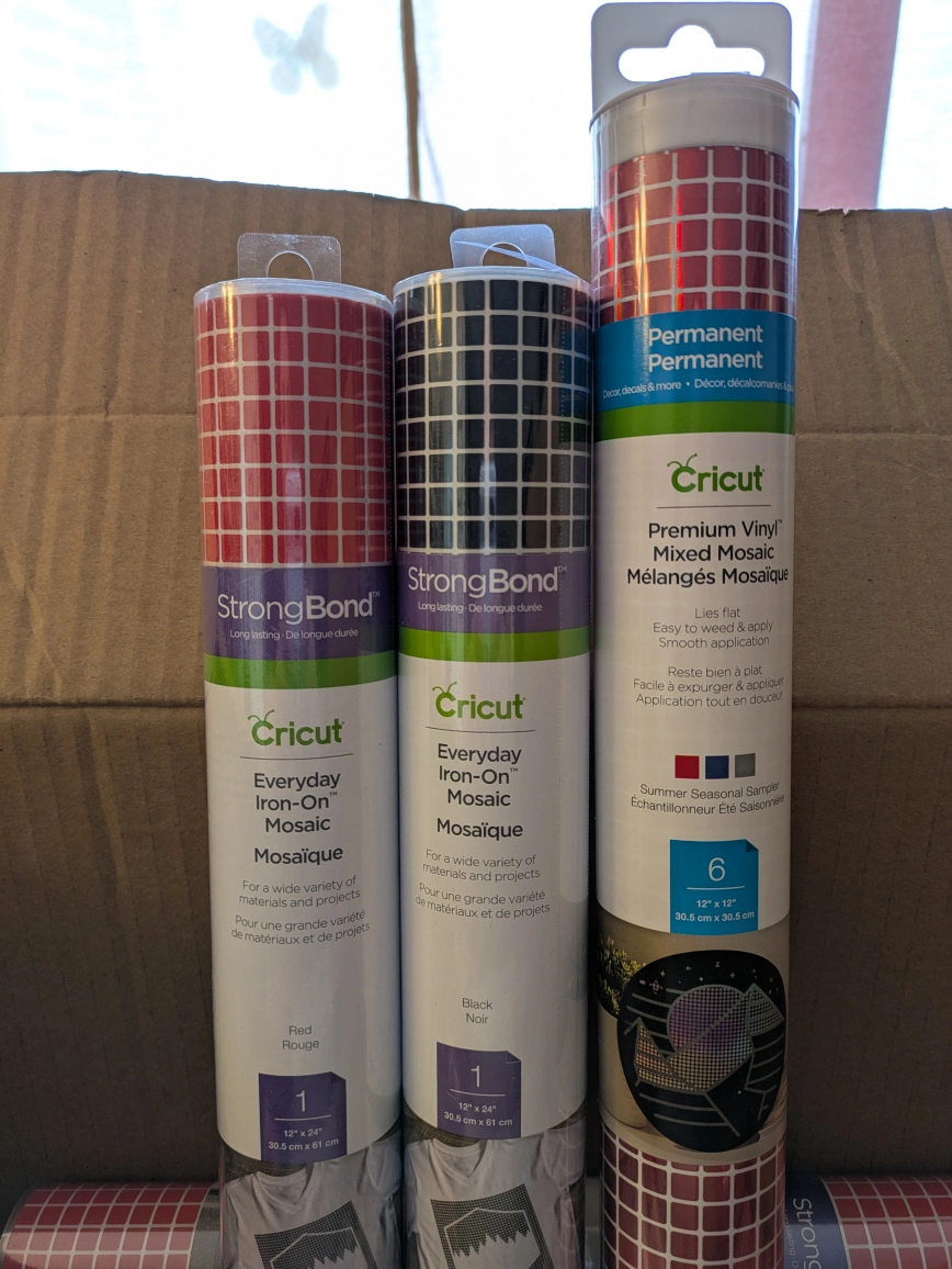 397Brand New, sealed packaging Cricut vinyl. A. Everyday Iron-On Mosaic in red or black. 12"x24" rolls. *SOLD OUT* B. Premium Vinyl Mixed Mosaic - comes with six 12"x12" sheets, 2 each of red, blue and silver colour. *SOLD OUT* $5/roll. Cash only. Don Mills and Finch. Several rolls of each available.