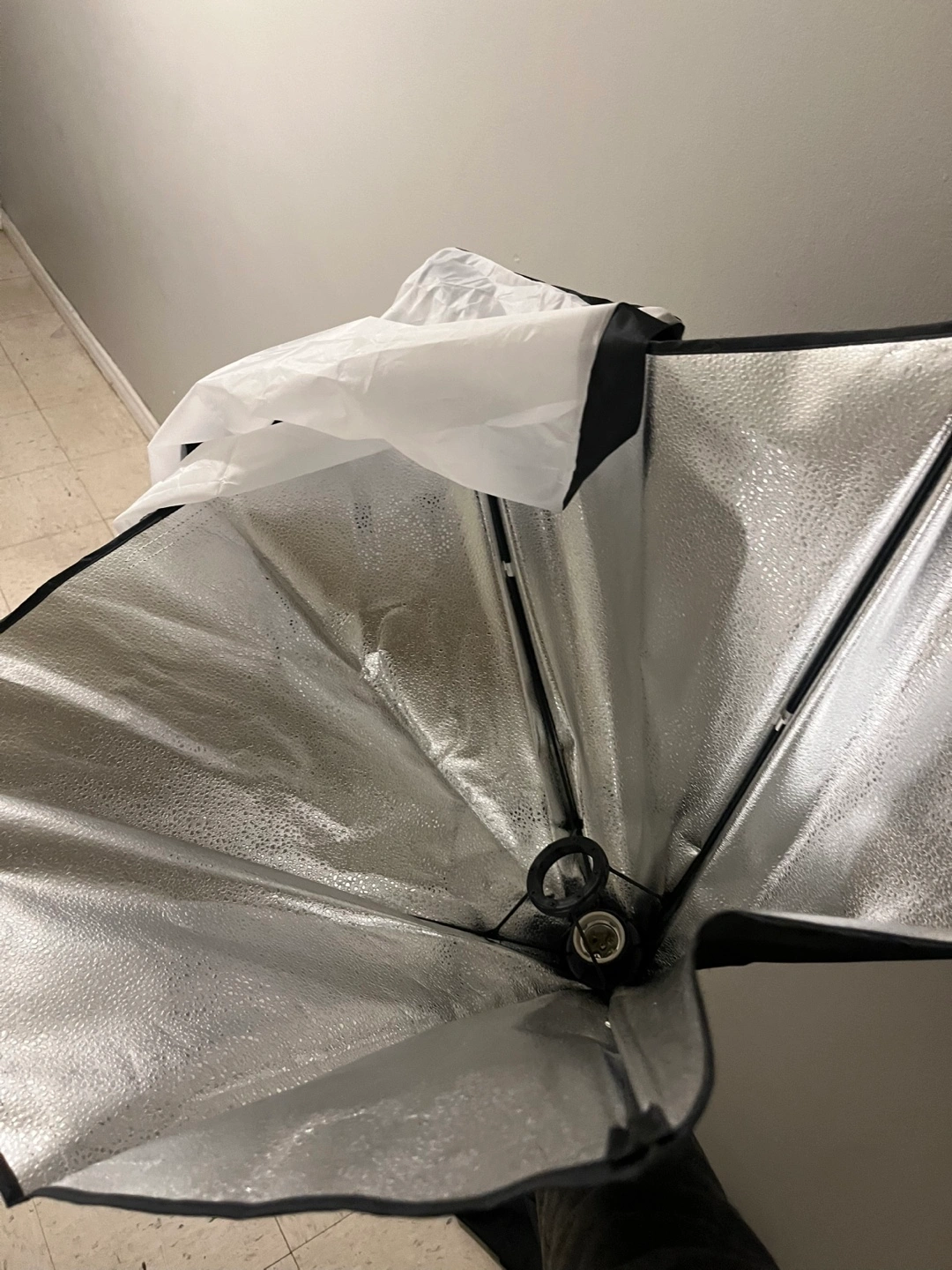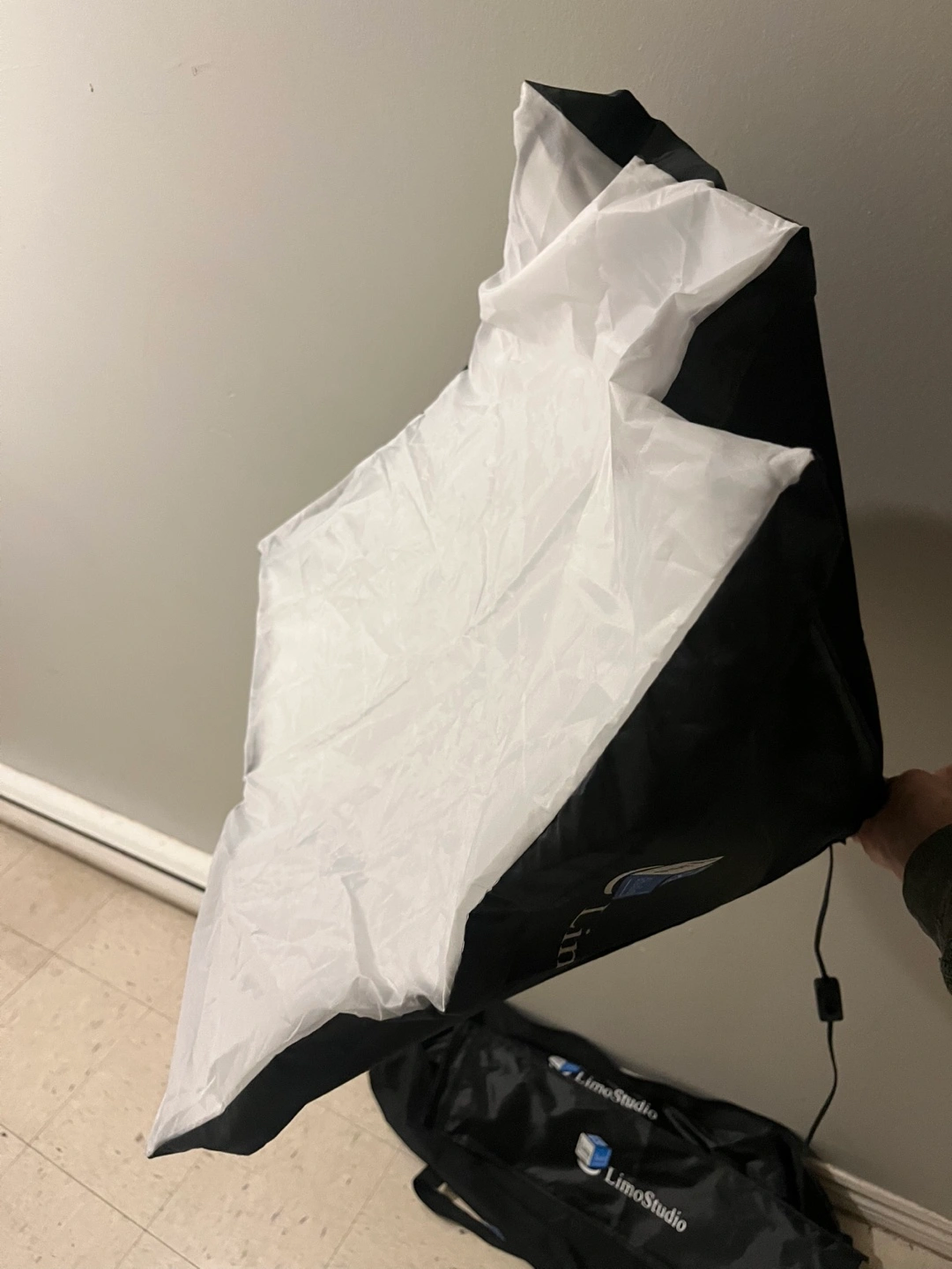 Both have white covers and individual bags for storage, switch controlled on the cord. Comes with a carrying case and are collapsible best for product or portrait photography.