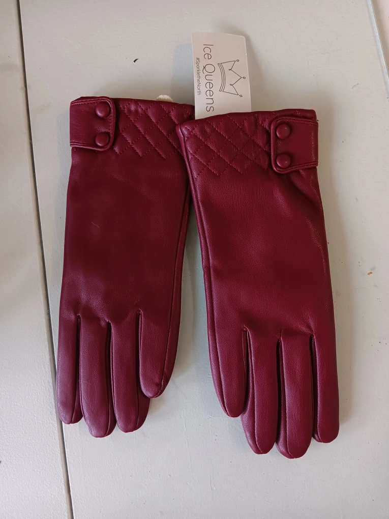 Women's burgundy gloves. Faux leather. Quilted detail. Snap button closure. Made in China. 100% polyurethane.