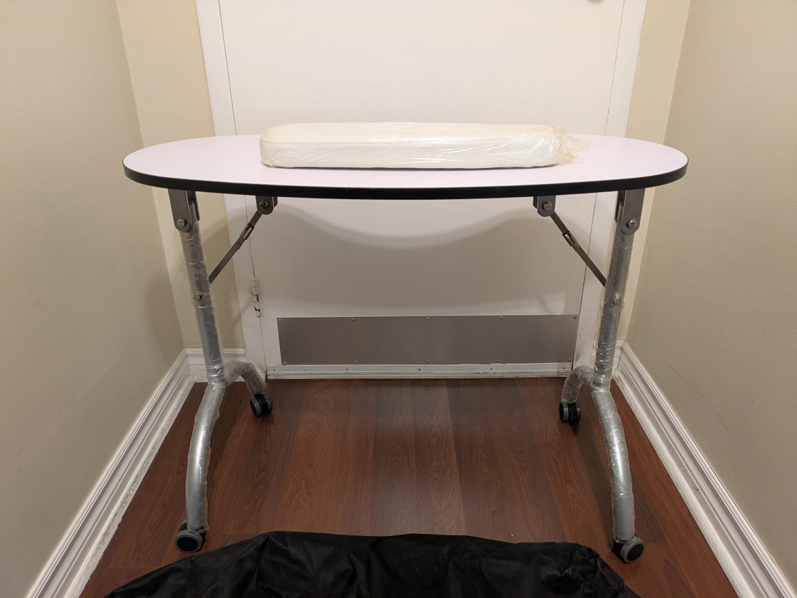 Portable manicure table with carry case. White tabletop. Silver frame. Includes comfortable cushioned armrest. Four lockable caster wheels for easy mobility and security once you're set up and ready to work. Convenient carry bag for storage and transport. Lightweight. Legs fold down for easy portability and storage when not in use. Locking clasp on legs keeps it secure while in use.