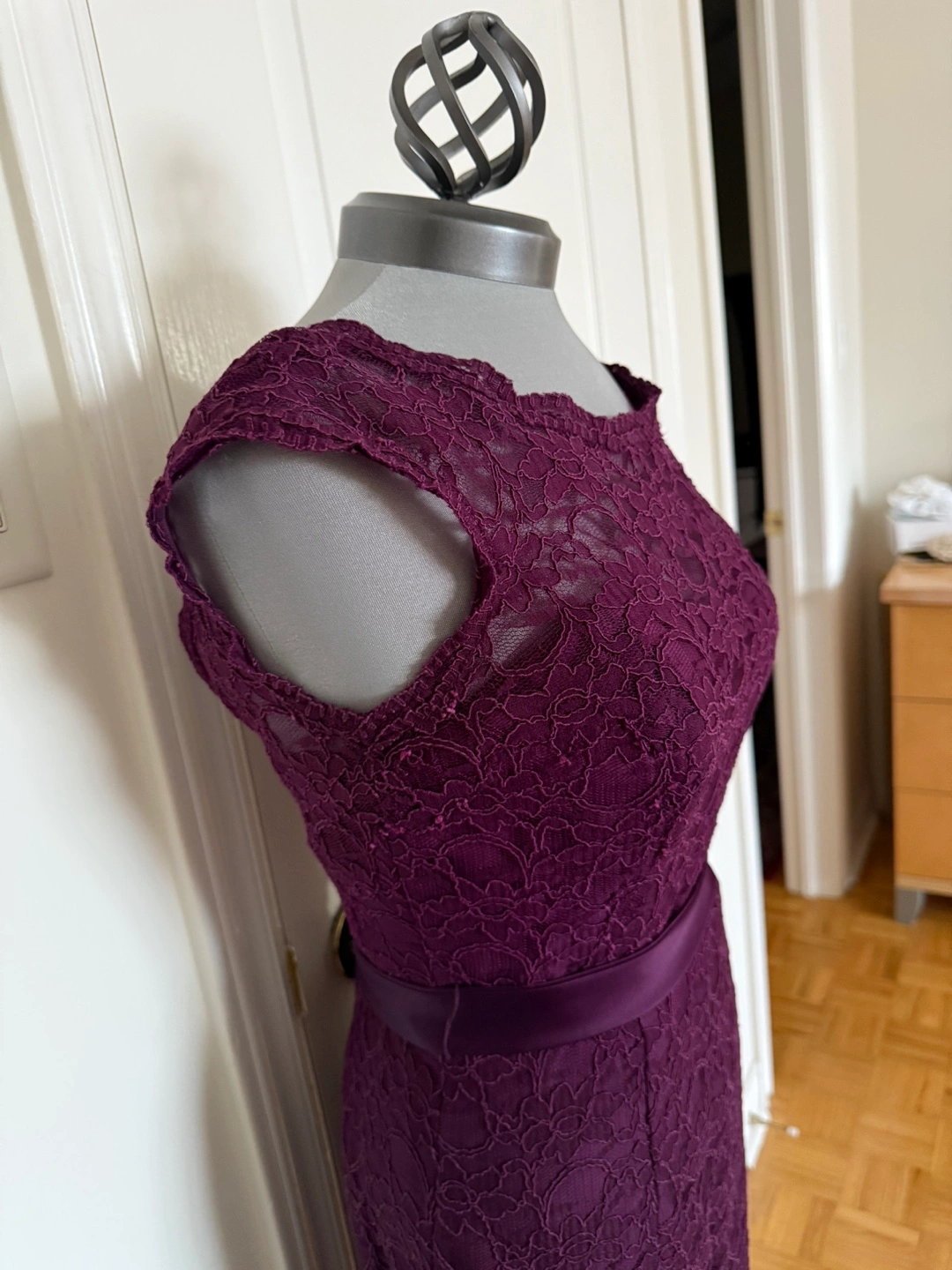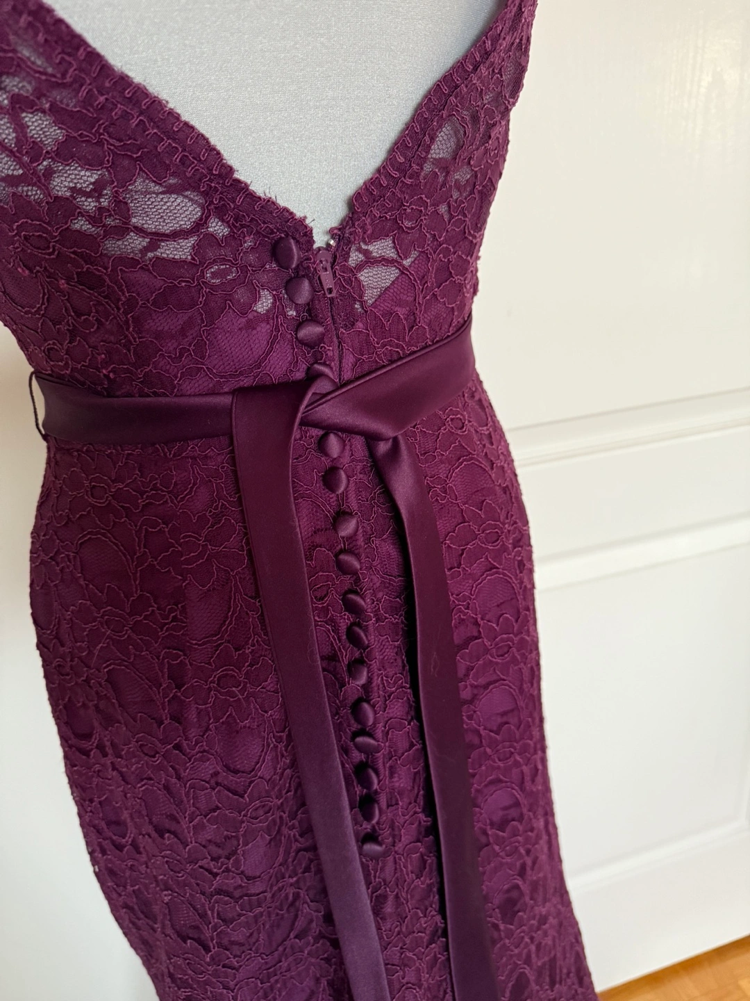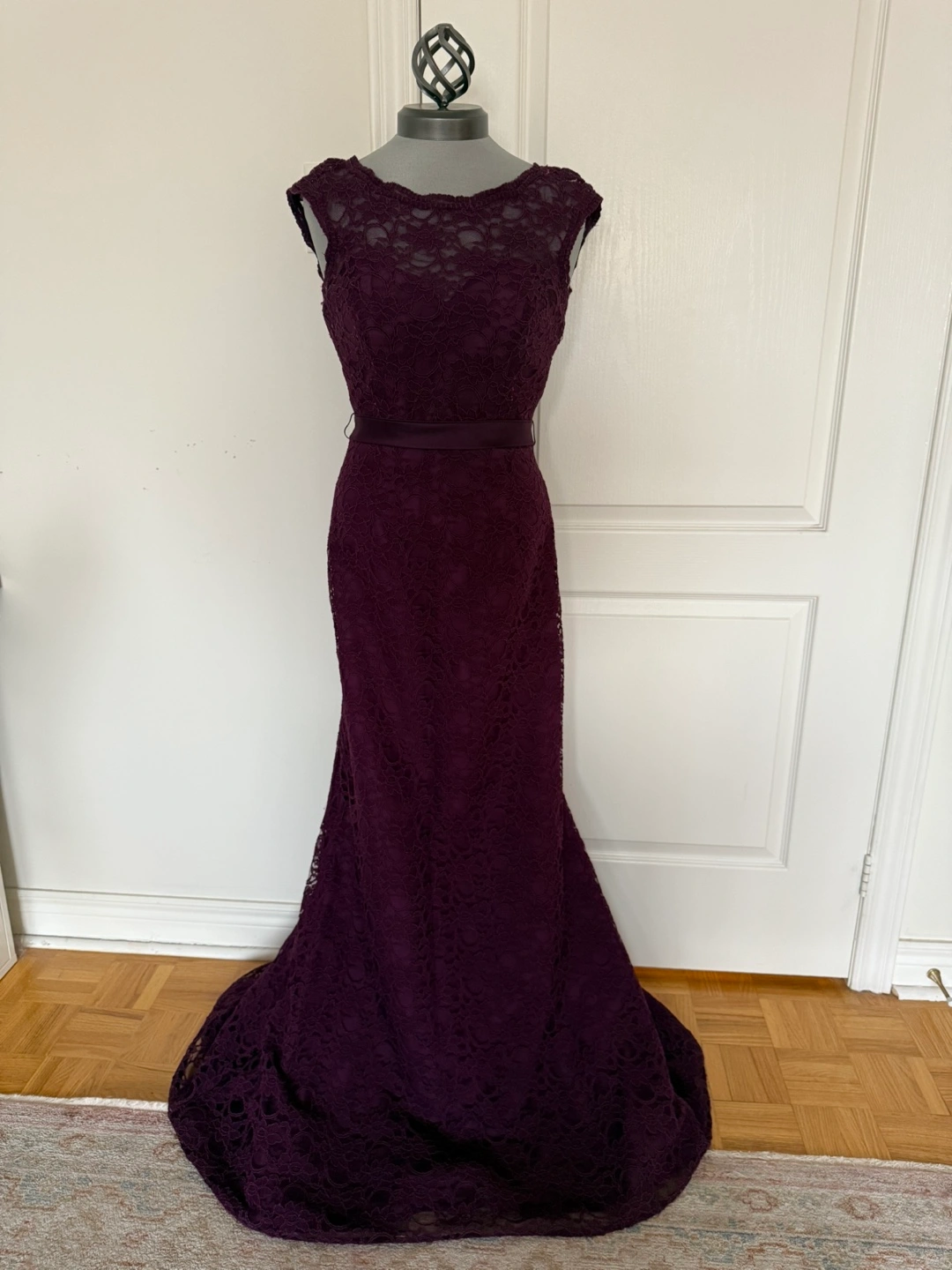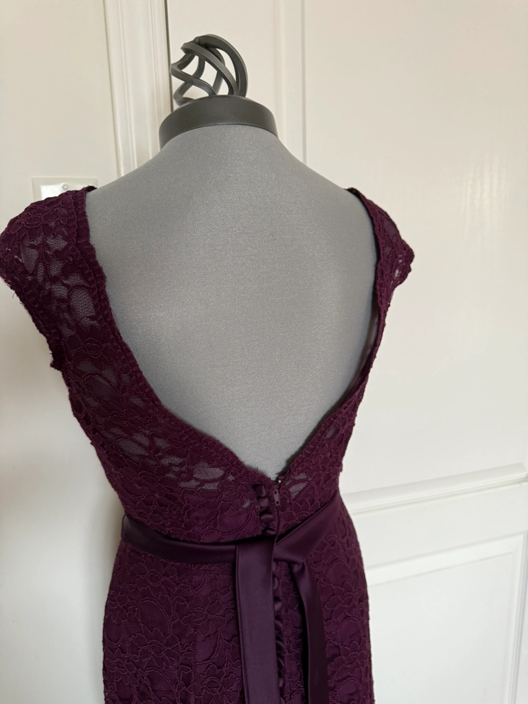 Gorgeous burgundy lace floor-length gown. Features a flattering silhouette, cap sleeves, and a low V-back. Beautiful satin sash included. Perfect for a wedding, prom, or other special occasion.