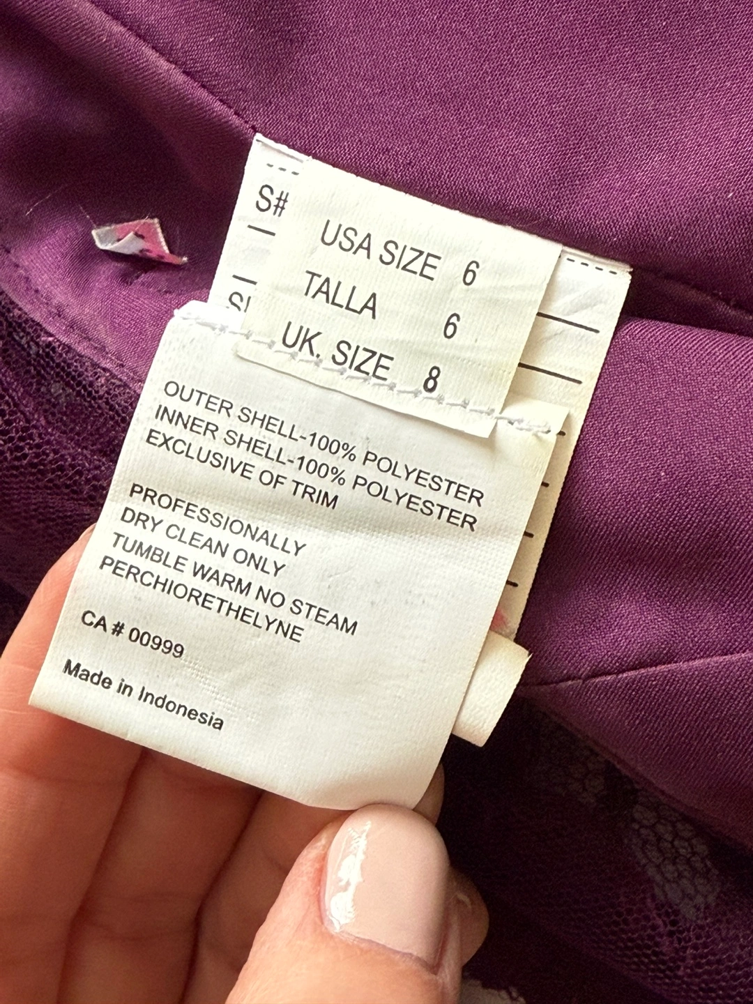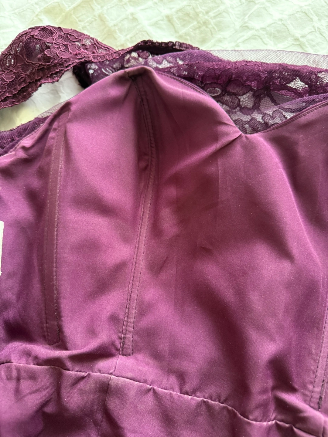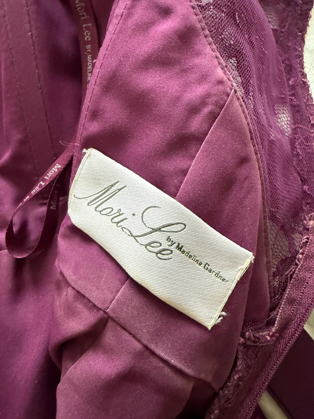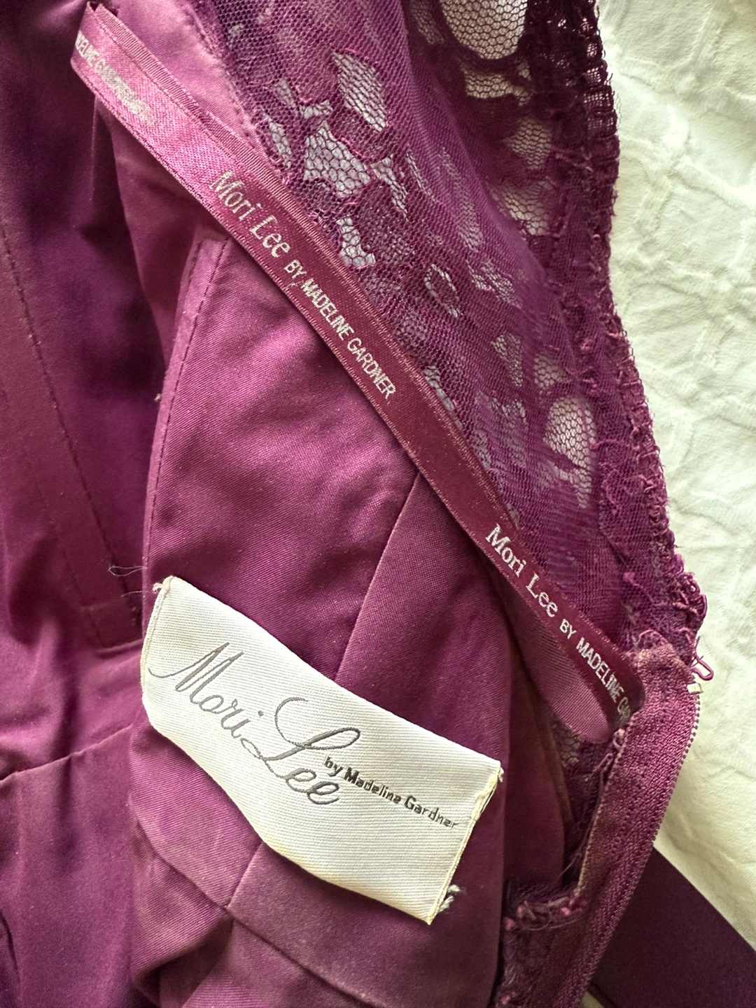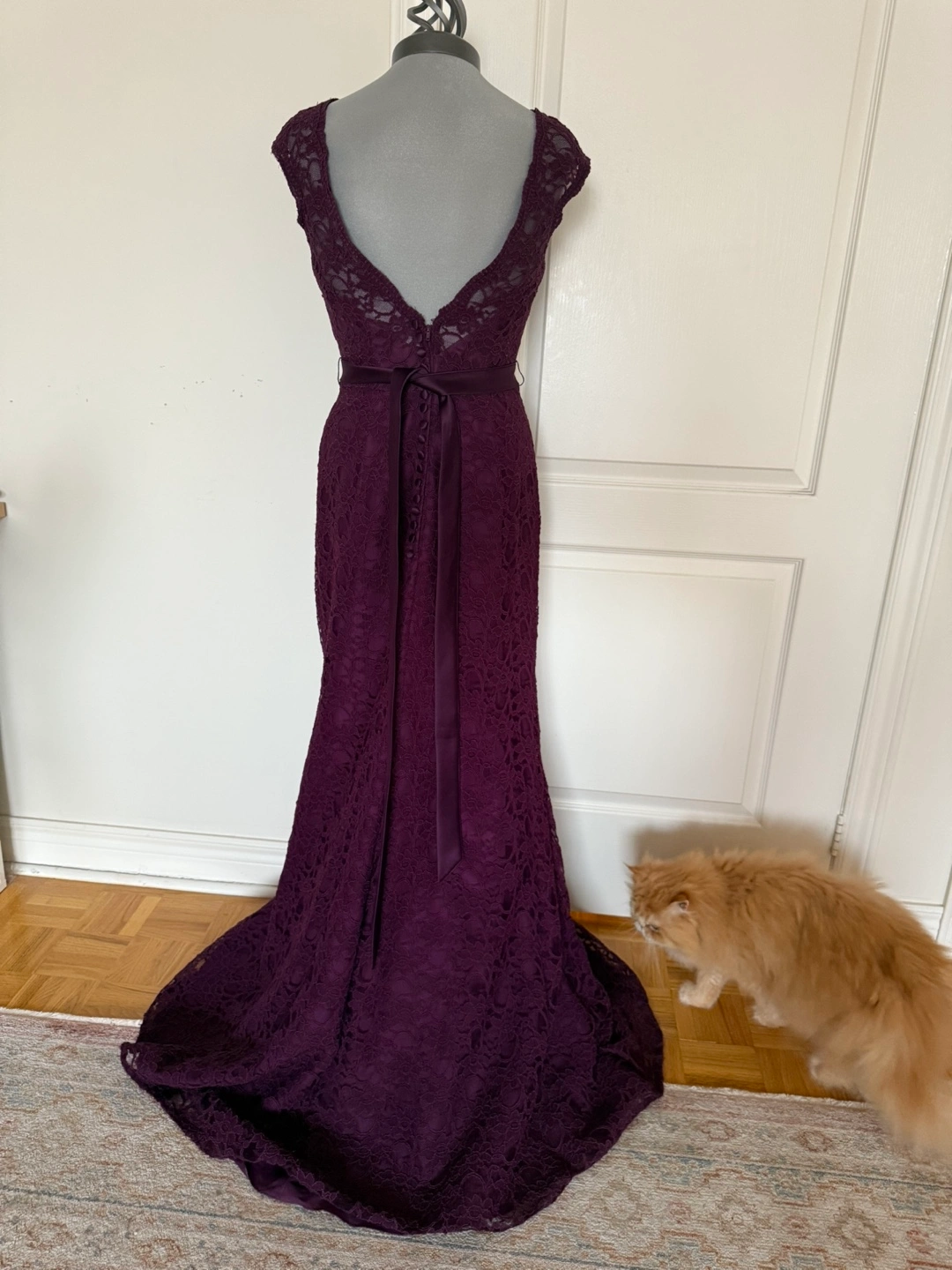 Gorgeous burgundy lace floor-length gown. Features a flattering silhouette, cap sleeves, and a low V-back. Beautiful satin sash included. Perfect for a wedding, prom, or other special occasion.