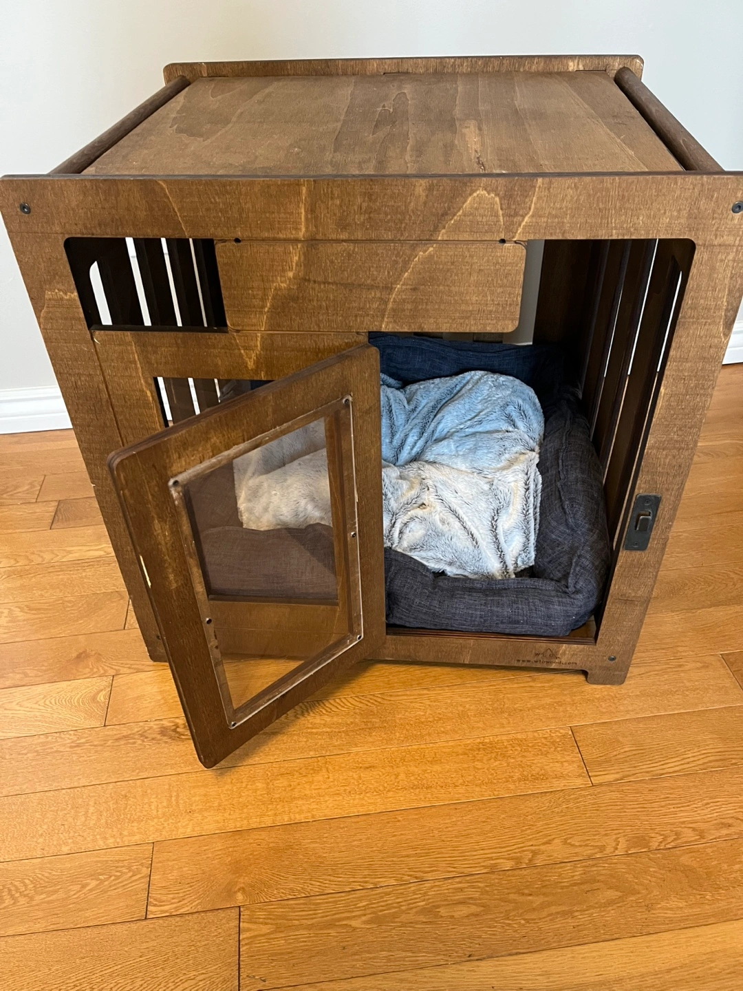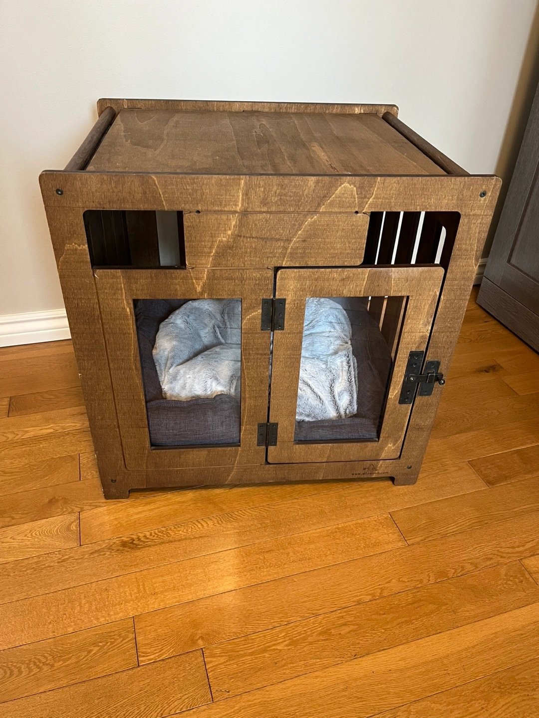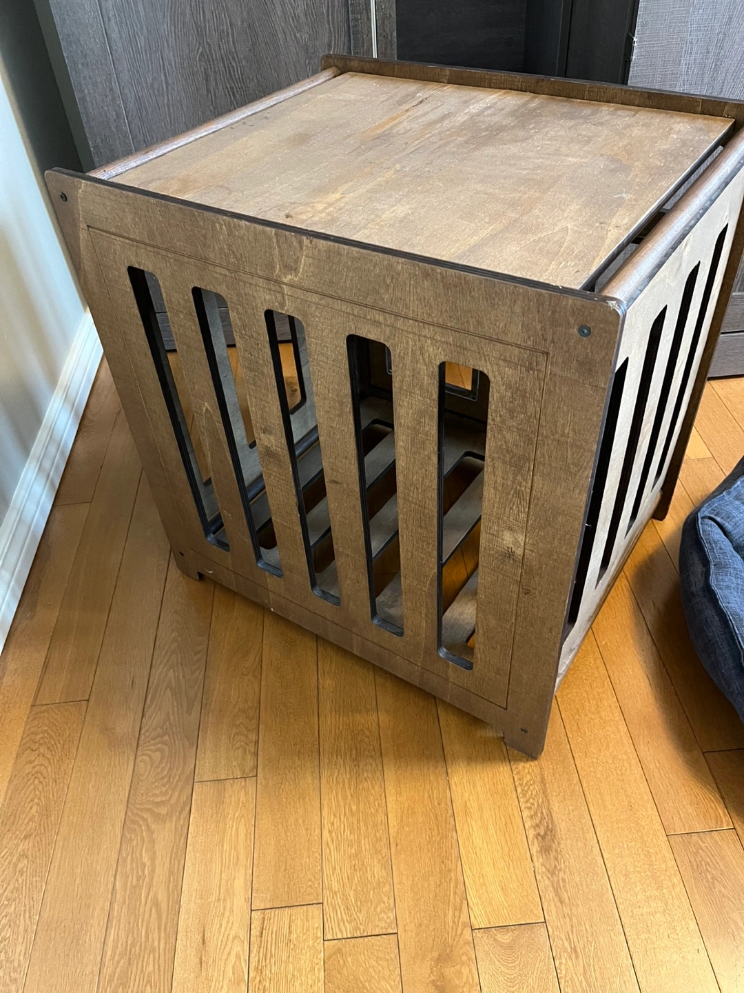 41Pick up in Utopia, light weight wooden Dog Crate, great for small spaces, stylish and sturdy. Comes with an oversized washed dog cushion/bed. 26” in length and height, 21” in depth. Recommended breed weight-5 to 24lbs.