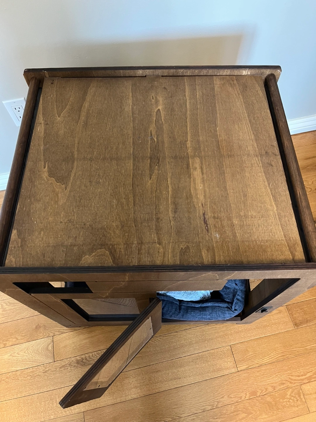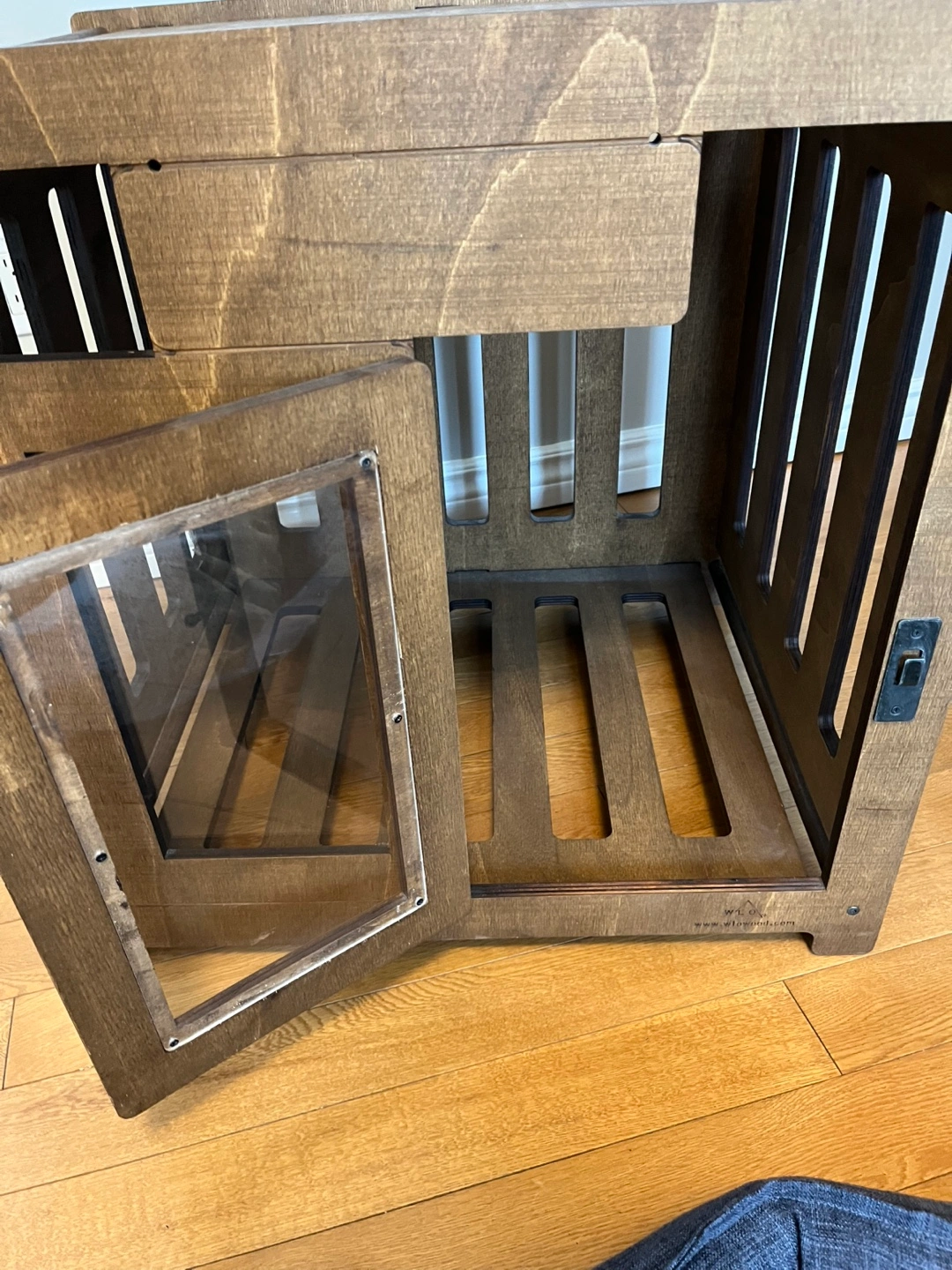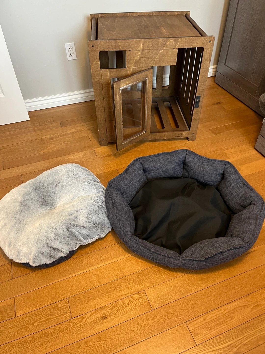 41Pick up in Utopia, light weight wooden Dog Crate, great for small spaces, stylish and sturdy. Comes with an oversized washed dog cushion/bed. 26” in length and height, 21” in depth. Recommended breed weight-5 to 24lbs.