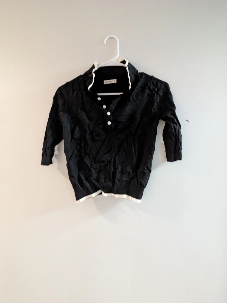 Black knit cropped cardigan. Features a collared neckline and three-button placket. White trim detail. Size small.