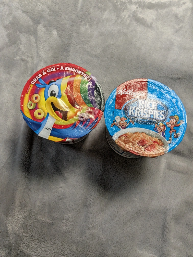 Two unopened single-serve cereal cups. One Froot Loops and one Rice Krispies. Grab and go breakfast.