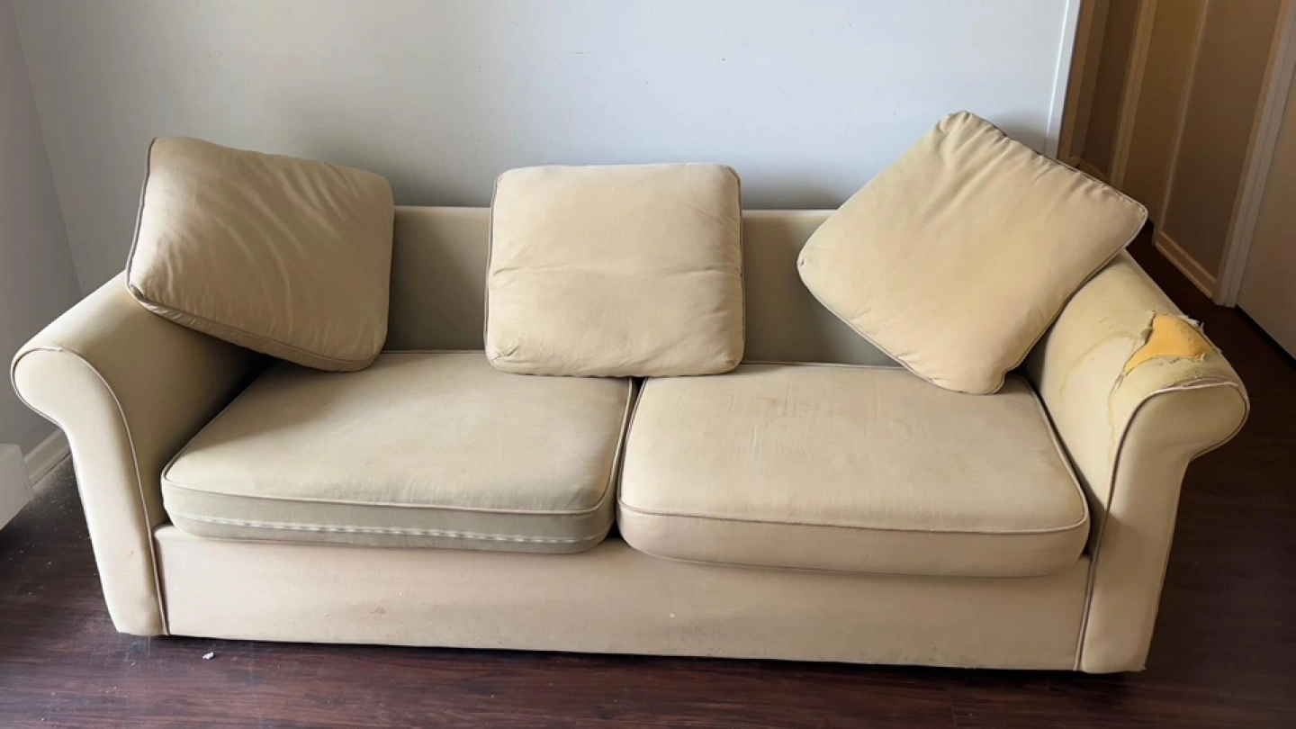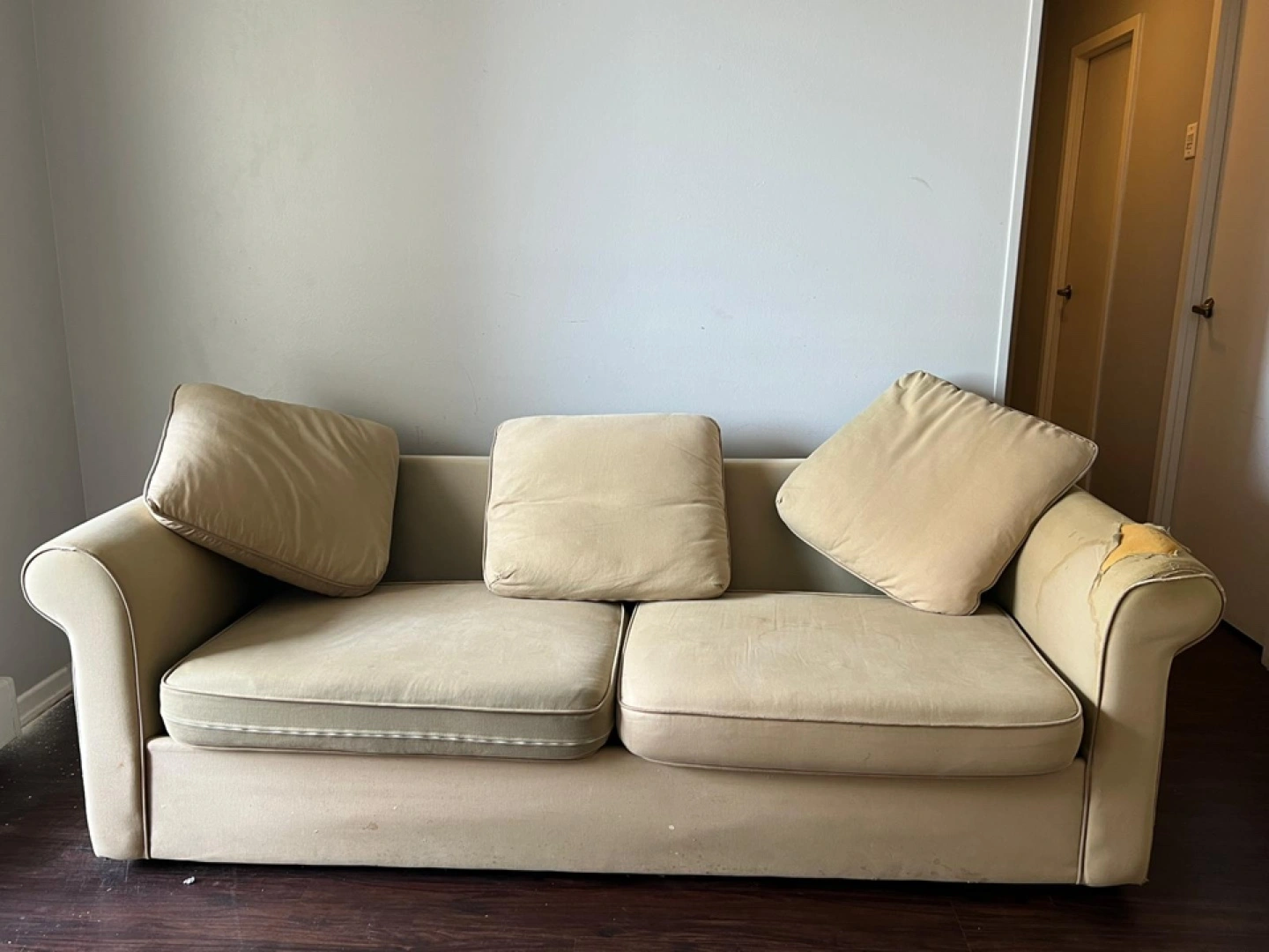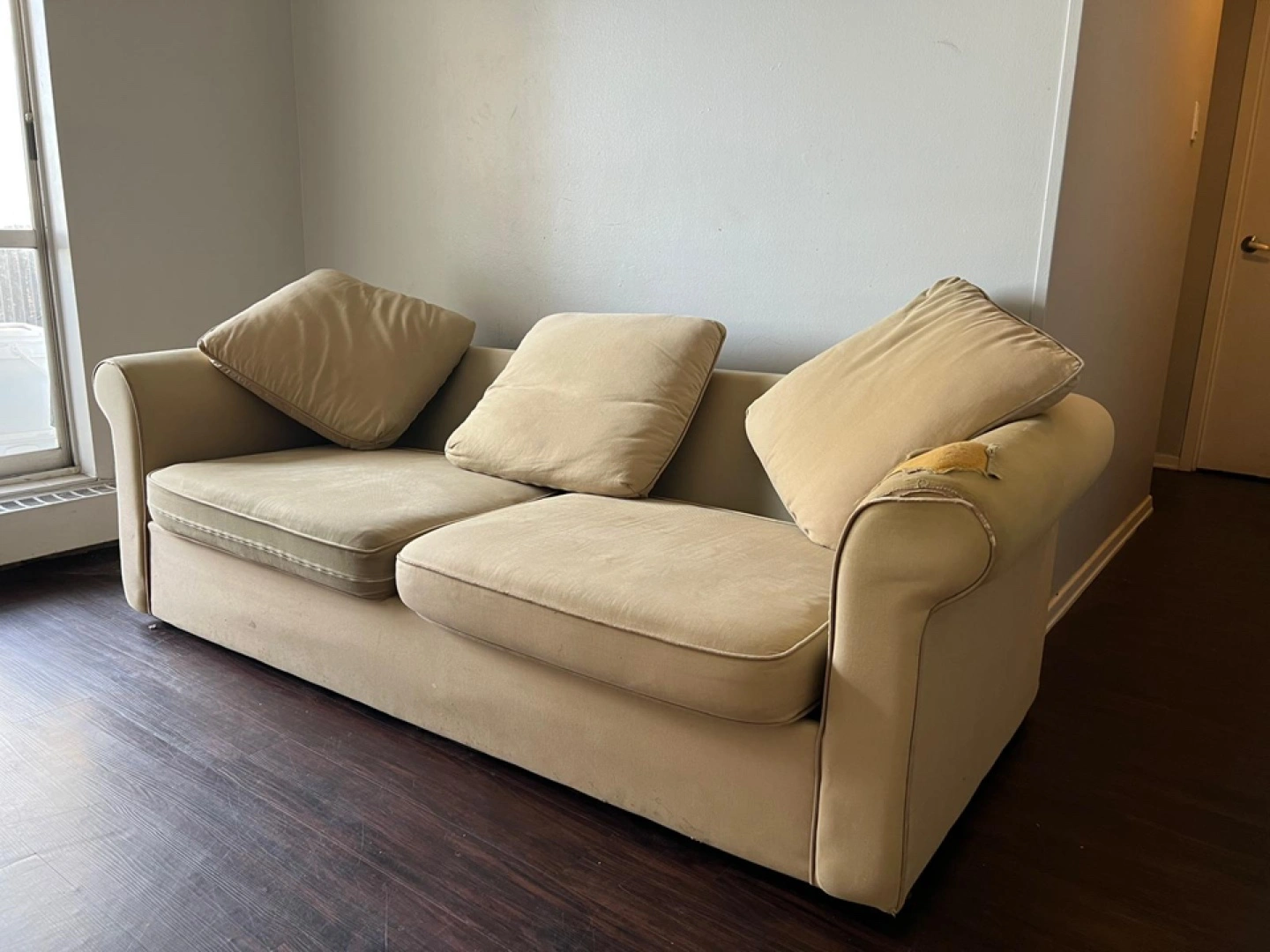 Giving away this well-loved beige couch for free! It’s still comfortable and sturdy but has some wear and tear, especially on one armrest (see photos). Great for a temporary setup, basement, or if you’re handy with repairs or a couch cover.