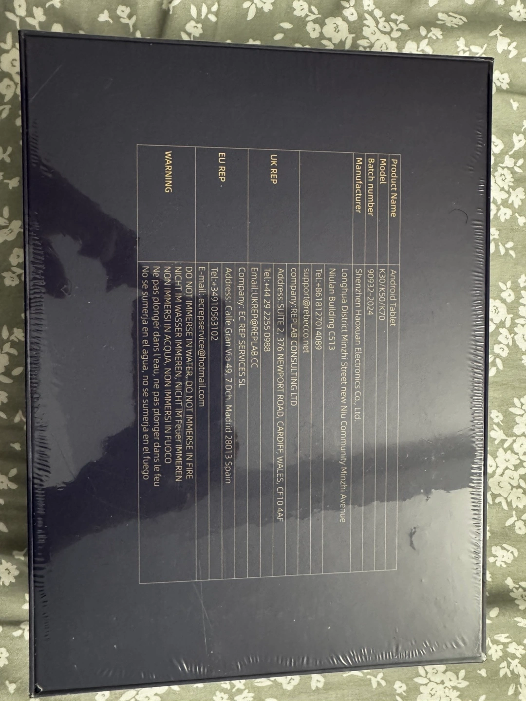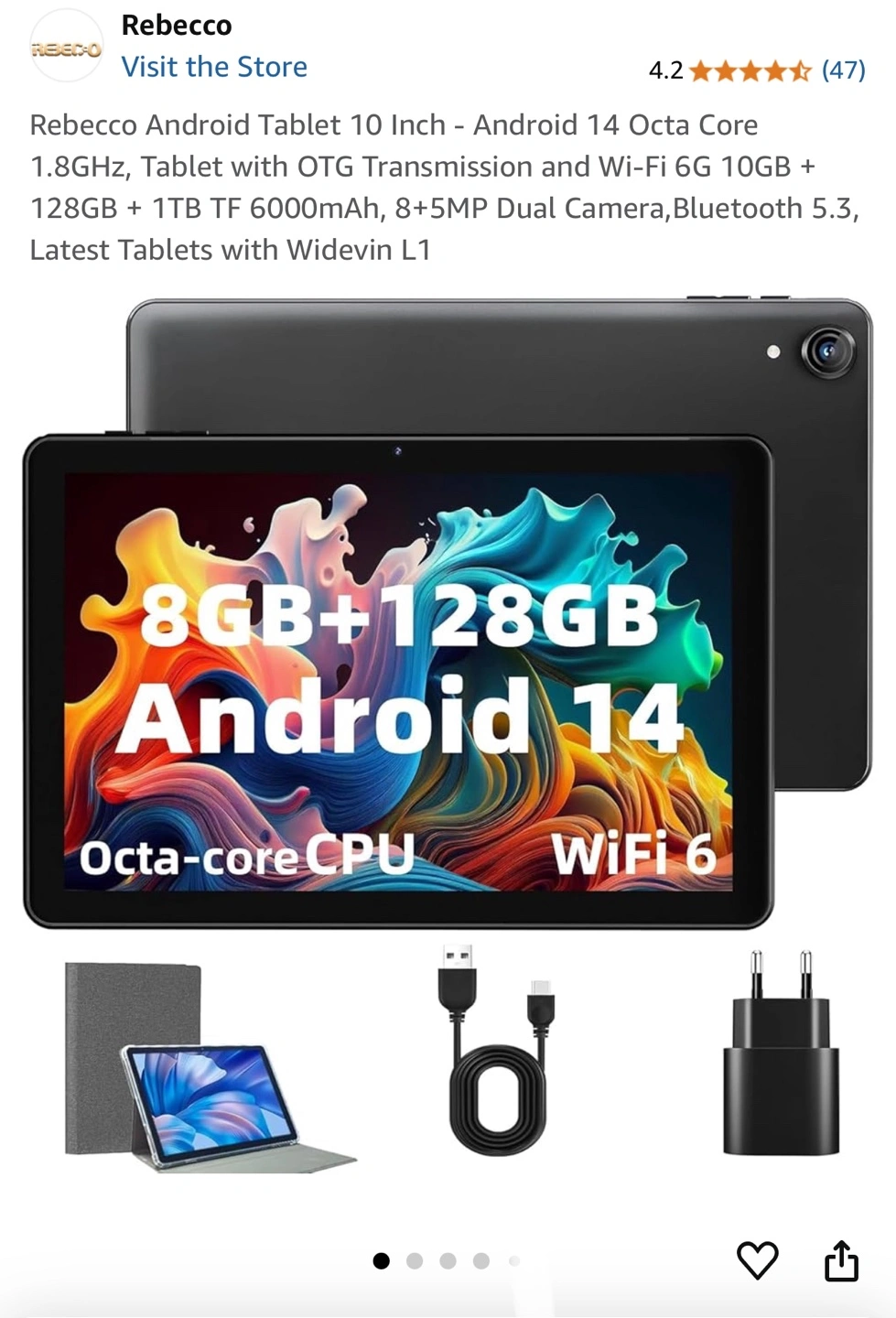 Brand new, sealed Rebecca Android tablet. 10-inch screen. Octa-core processor. Android 14. 8GB RAM + 128GB storage. Wi-Fi 6. Bluetooth 5.3. Dual cameras. Includes charger and cable.