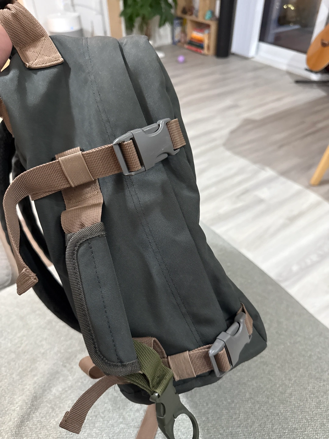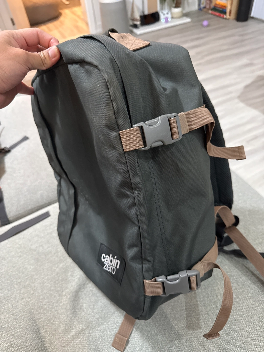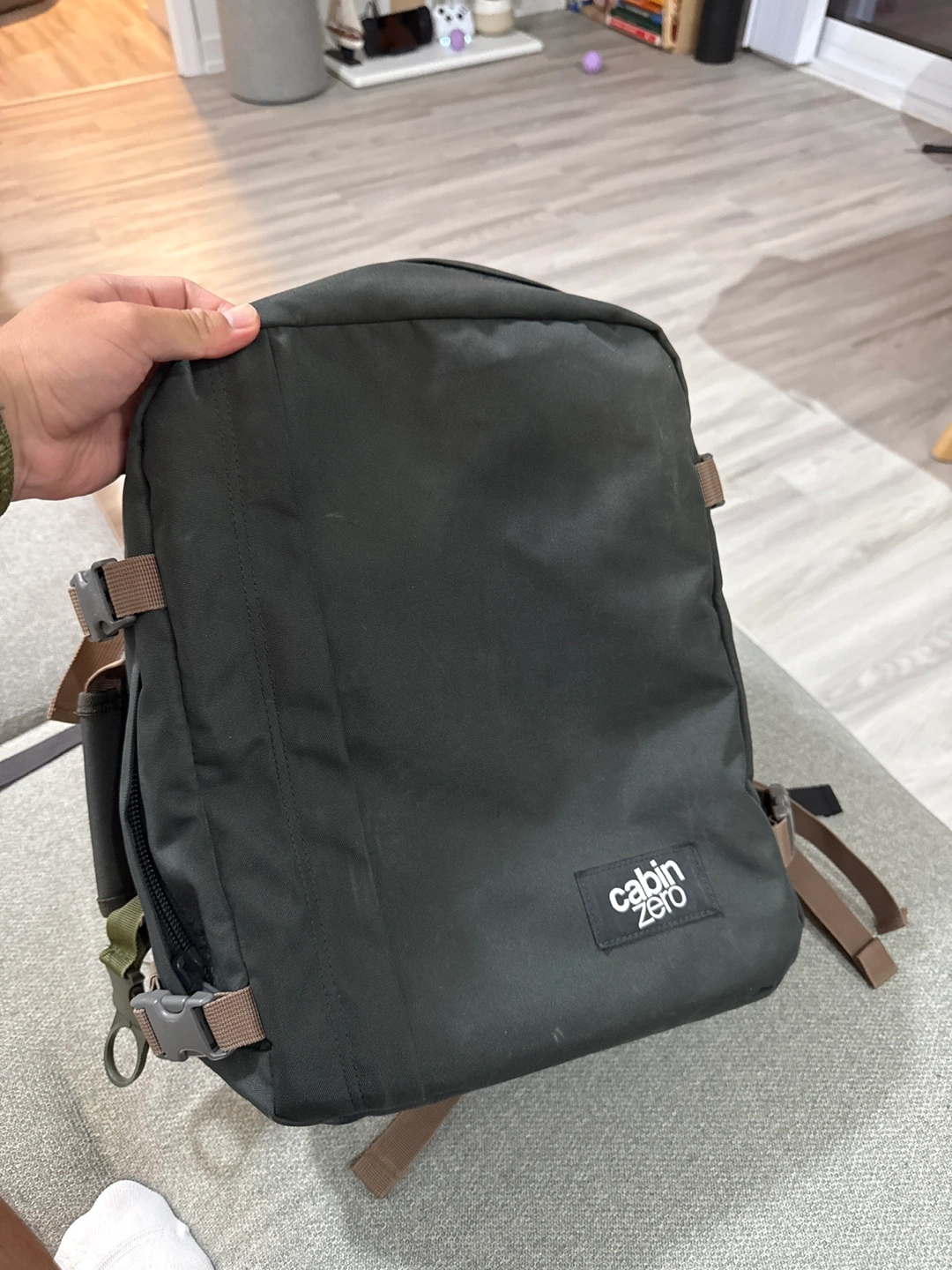 Dark green Cabin Zero backpack. Multiple compartments and pockets. Adjustable straps. Durable material. It’s the best for travel serves as personal item and fits a lot of things. I’ve travelled through Europe with no issues.