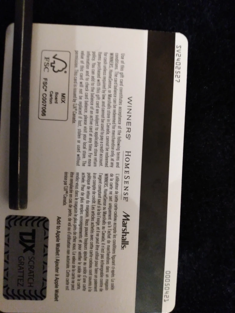 $500 Unused gift card. for only $350 Scratch-off area still intact. Valid at Winners, HomeSense, and Marshalls locations.